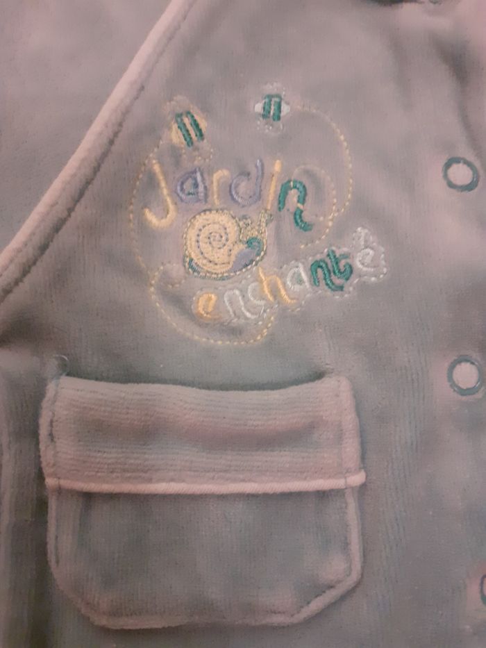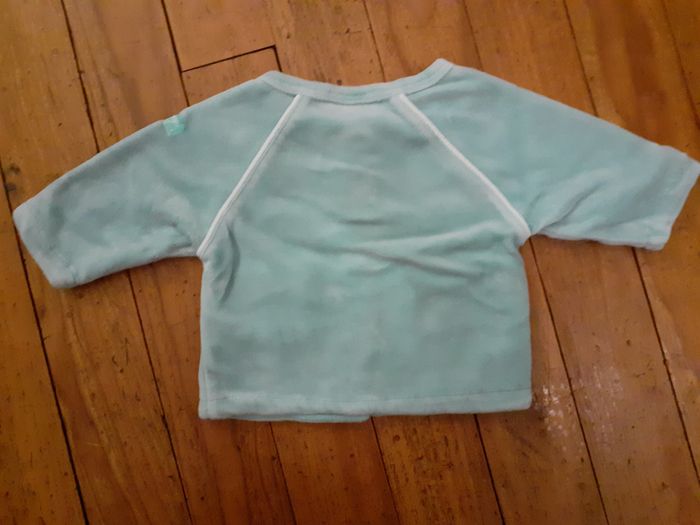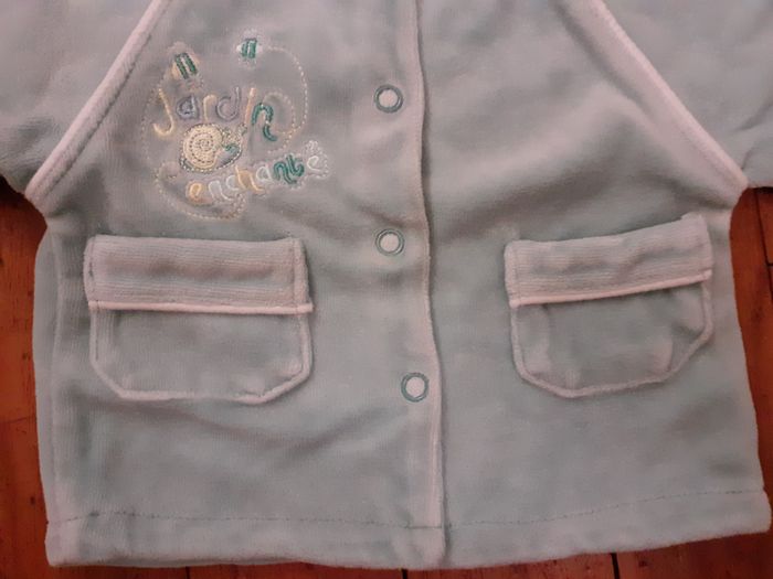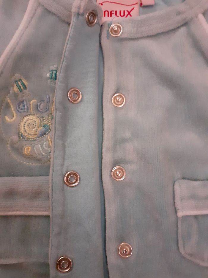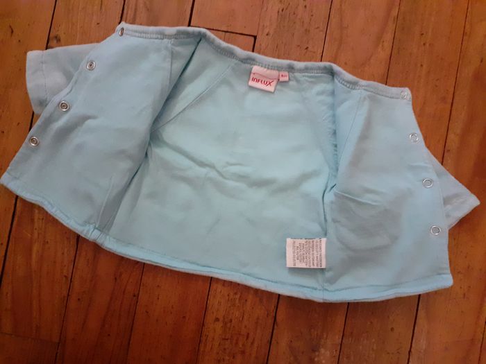 Joli gilet très doux Taille : Naissance Marque : Influx Couleur : Turquoise Fermeture par boutons pression Composition : 76% Coton et 24% Polyester Etat impeccable