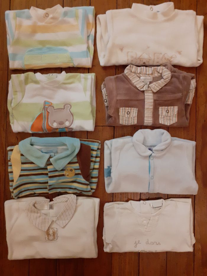 Très joli lot de 8 grenouillères Taille : Naissance Différentes marques : 3 Pommes, Orchestra, Baby Clayeux, King Bear, Obaïbi, Petit Bateau Coloris : Assortis Etat impeccable