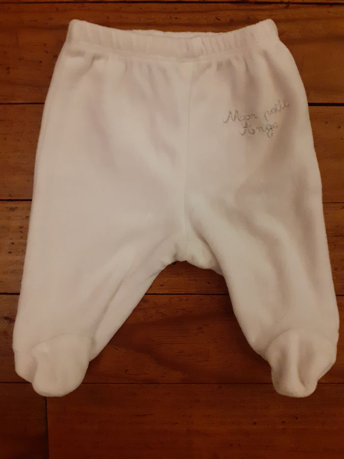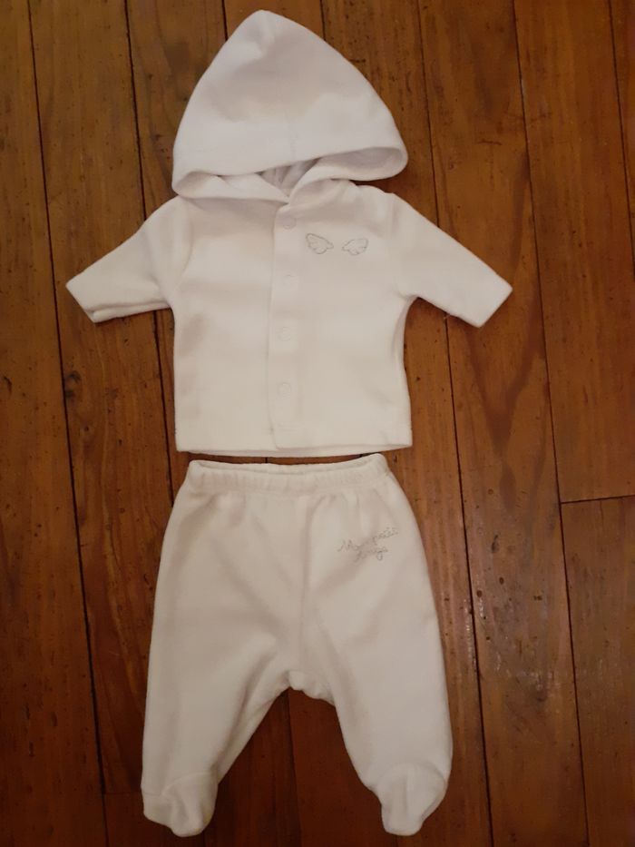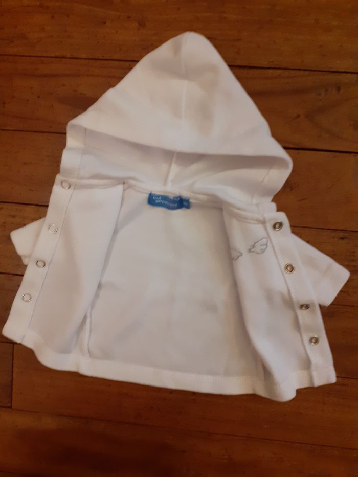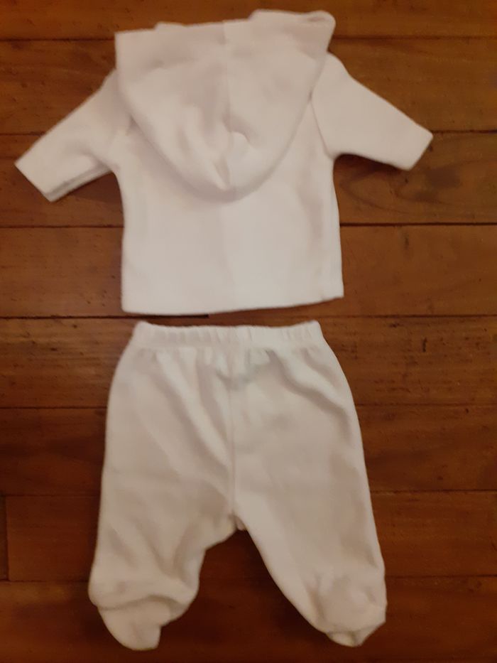 Ensemble Veste et Pantalon - Tout Simplement Très joli ensemble composé d'une veste à capuche et d'un pantalon Taille : Naissance Composition : 77% Coton, 23% Polyester Coloris : Blanc Taille élastiquée pour le pantalon, fermeture par pression pour la veste Marque : Tout simplement Etat impeccable