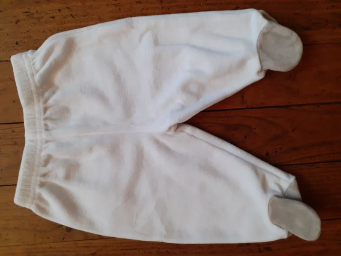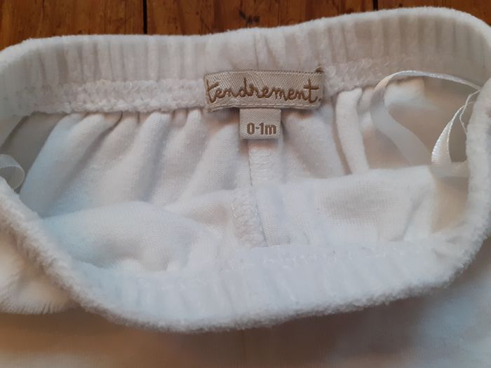 Joli pantalon Taille : 1 mois Marque : Tendrement Taille élastiquée Coloris : Blanc, pieds coloris marron glacé Etat impeccable