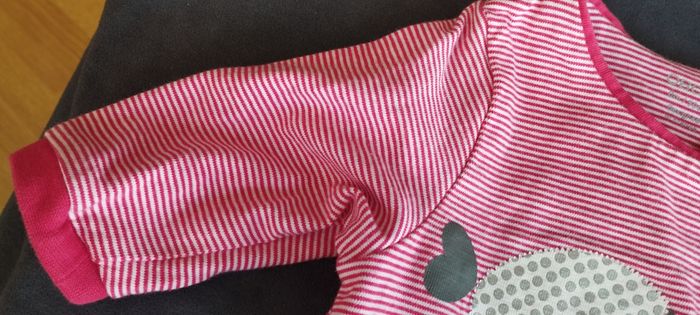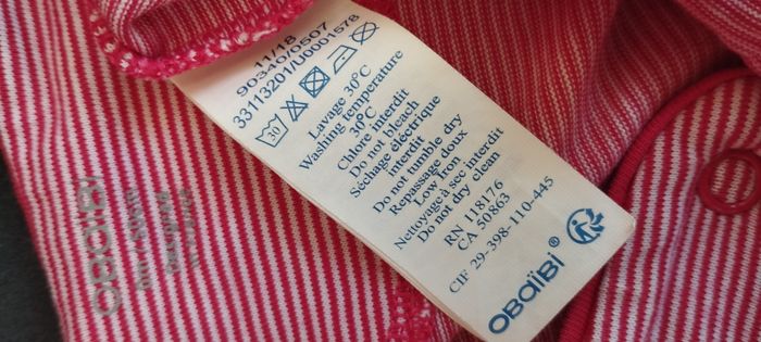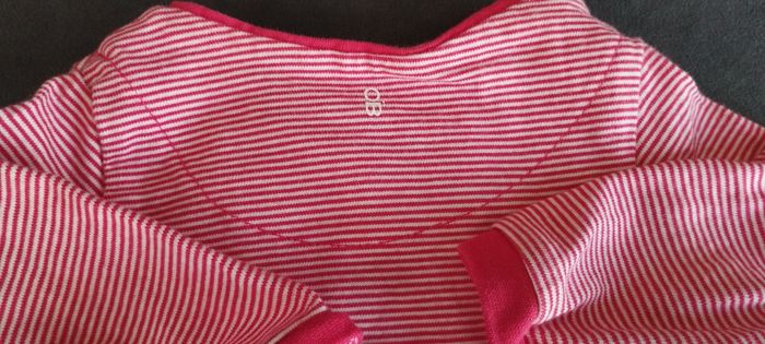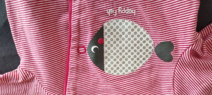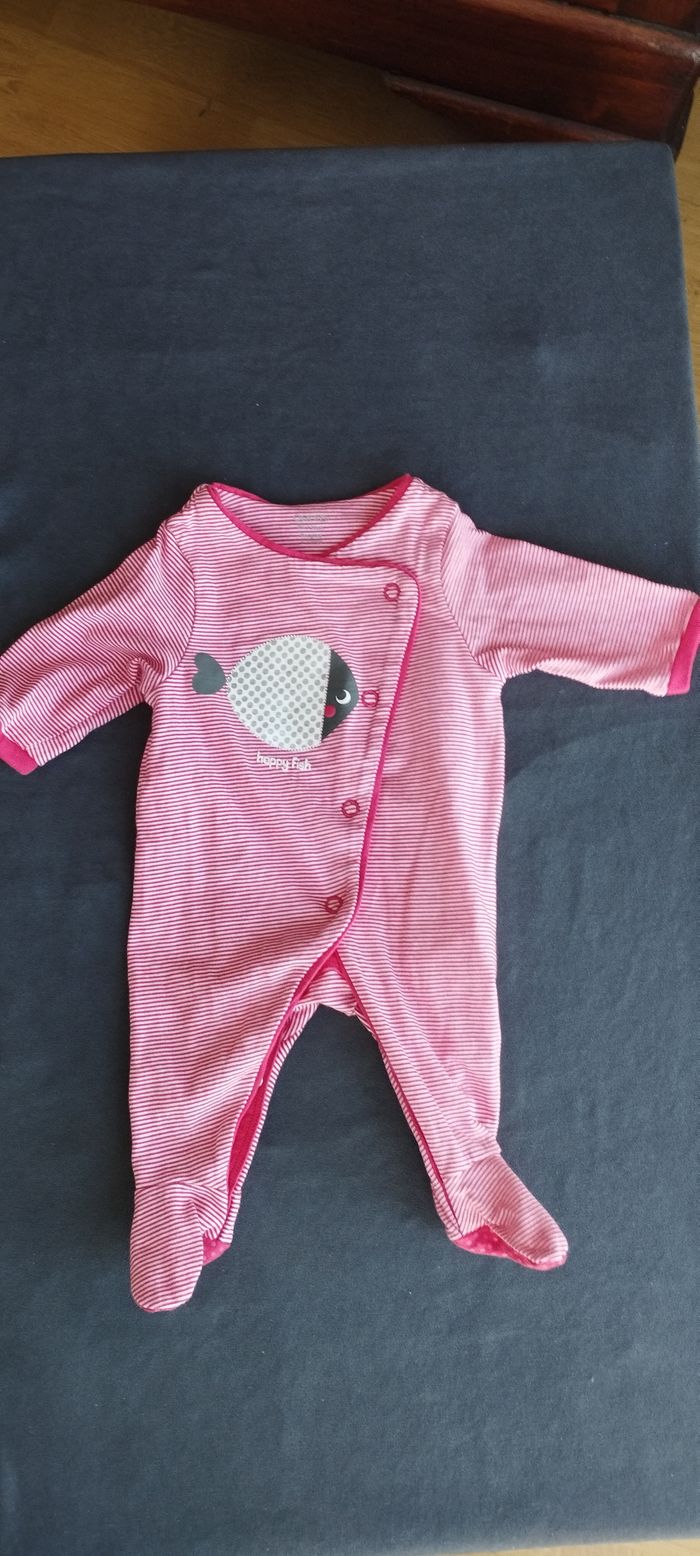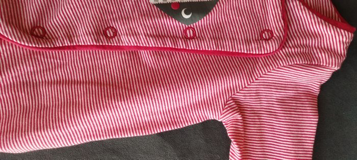 Mignon pyjama pour bébé fille ou garçon naissance de chez Obaïby d'Okaïdi, rouge à rayures blanches, avec motif rigolo poisson blanc et gris argenté, tissus épais en coton doux. Très bon état.