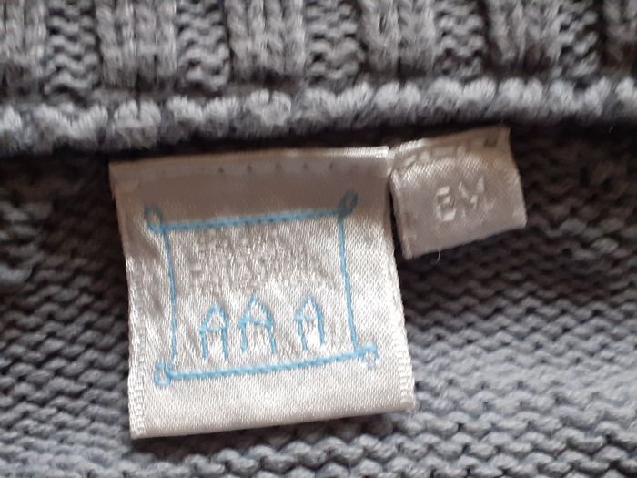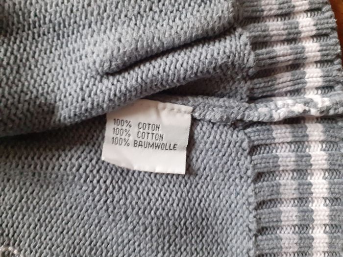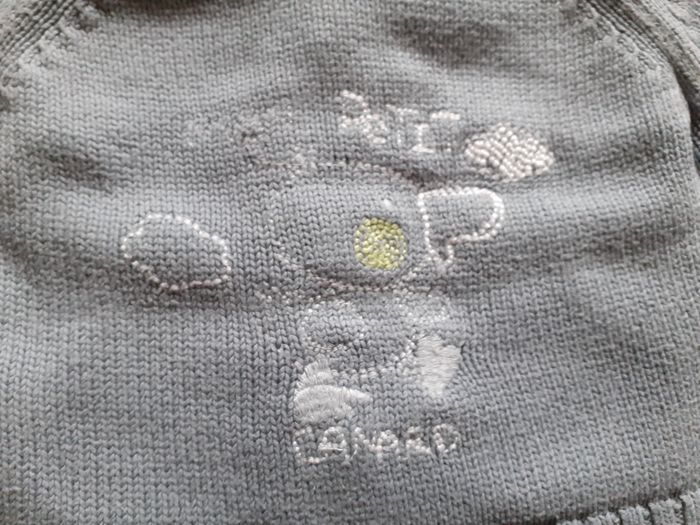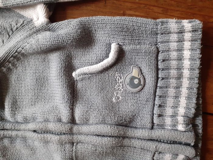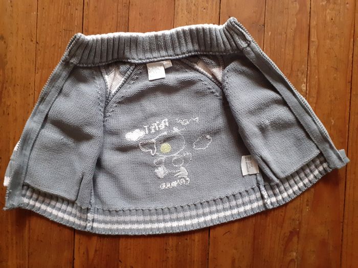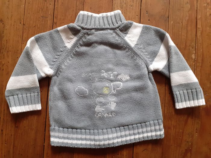 Très joli gilet Marque : Cadet Rousselle Taille : 6 mois Coloris : Gris et Blanc Col montant Deux petites poches Composition : 100% Coton Etat impeccable