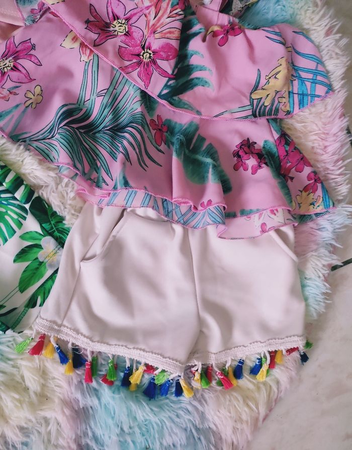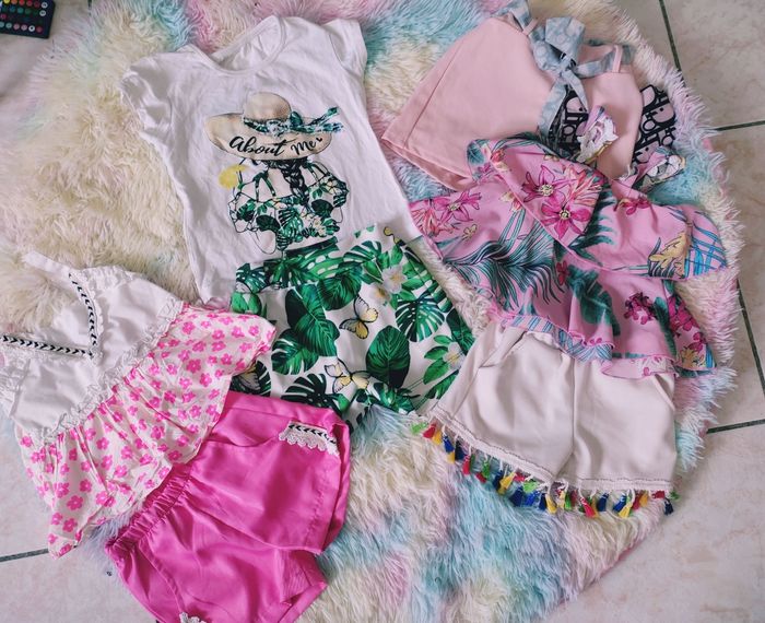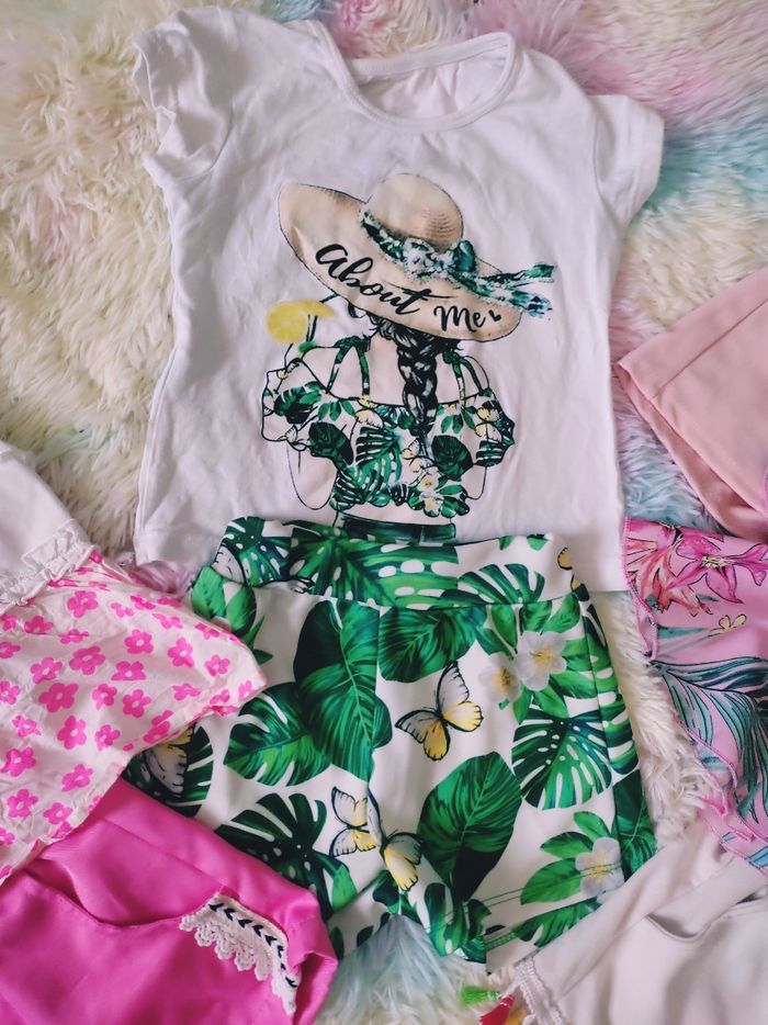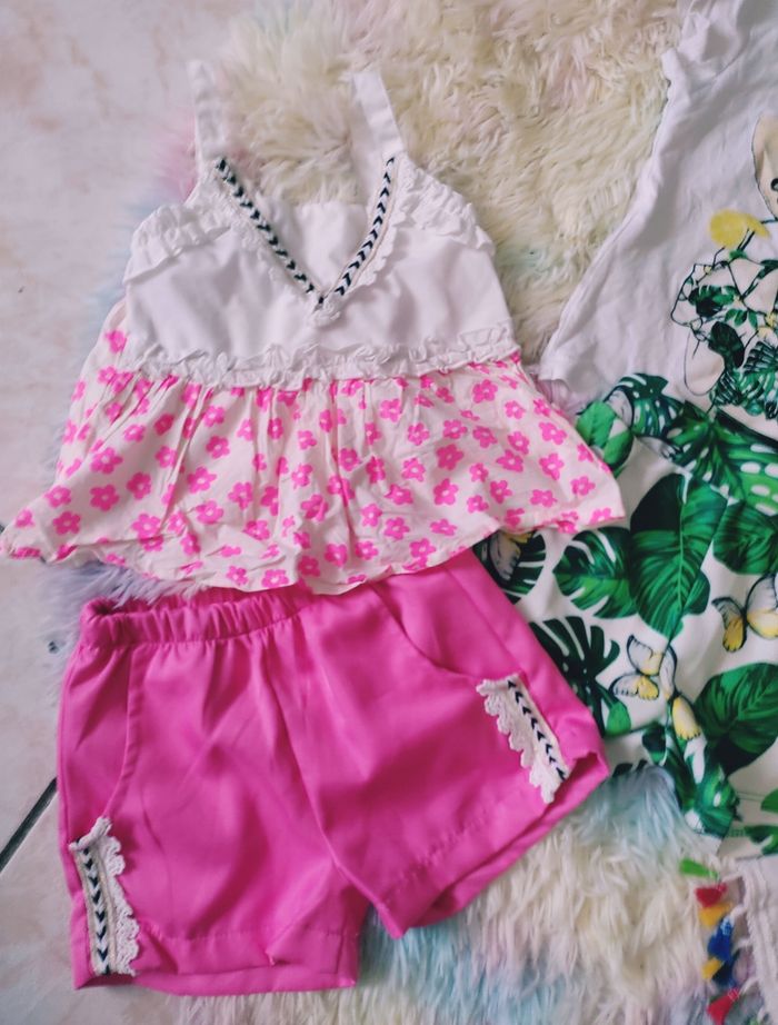 Lot chicaprie de 4 ensembles 3/4 ans mode #ete #set #ensemble #short #top #rose #mode #tropical #fleurs #plage #moderne #chicaprie