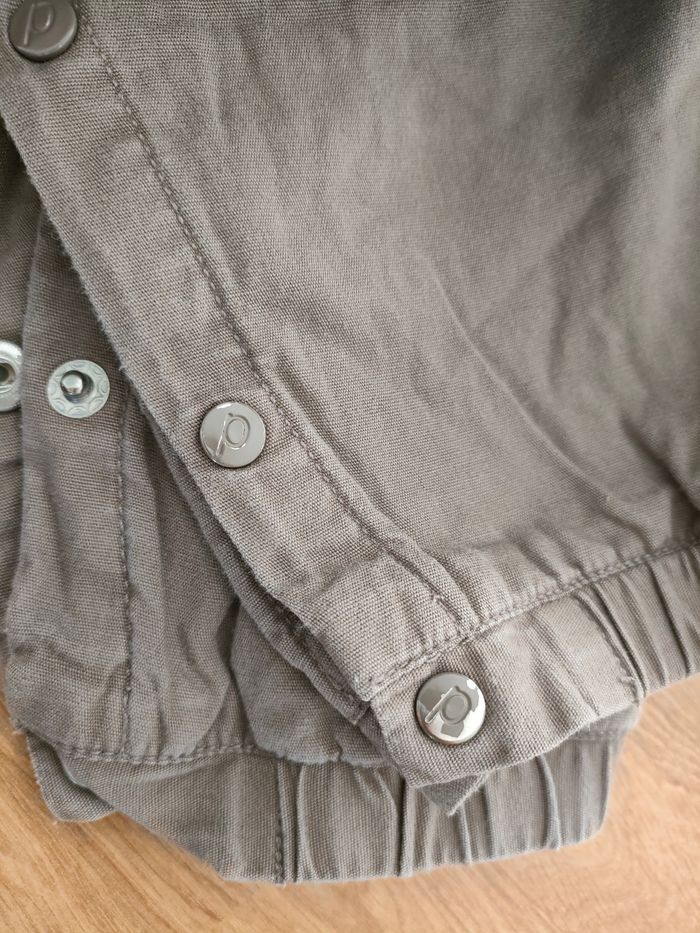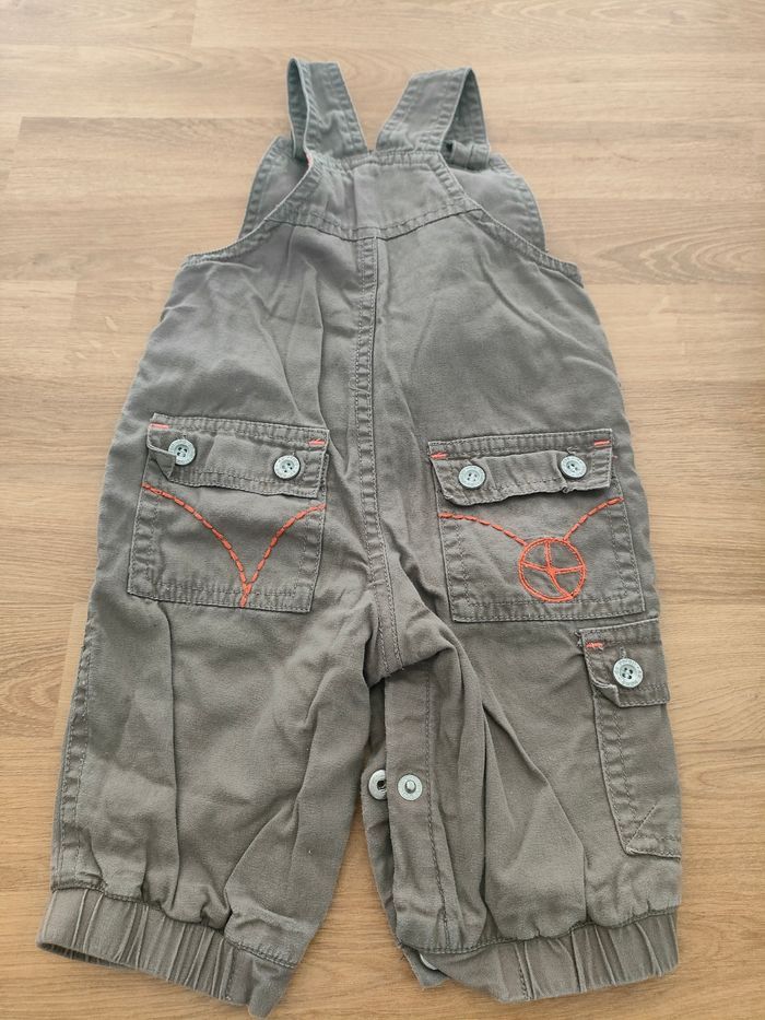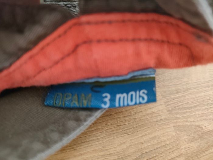 Salopette marron/orange taille 3 mois, DPAM. Certains boutons montrent des signes d'usure, et sont à renforcer. Quelques boutons pressions sont un peu usées aussi (voir photo). Il y a toujours le bouton supplémentaire d'origine sur l'étiquette à l'intérieur.