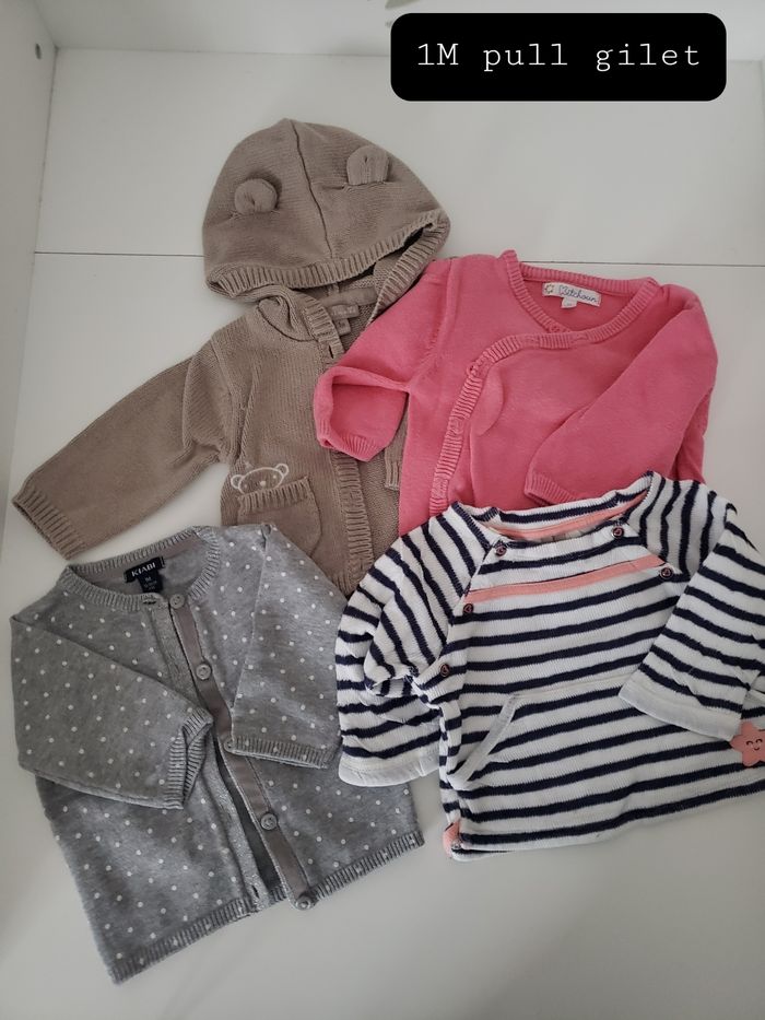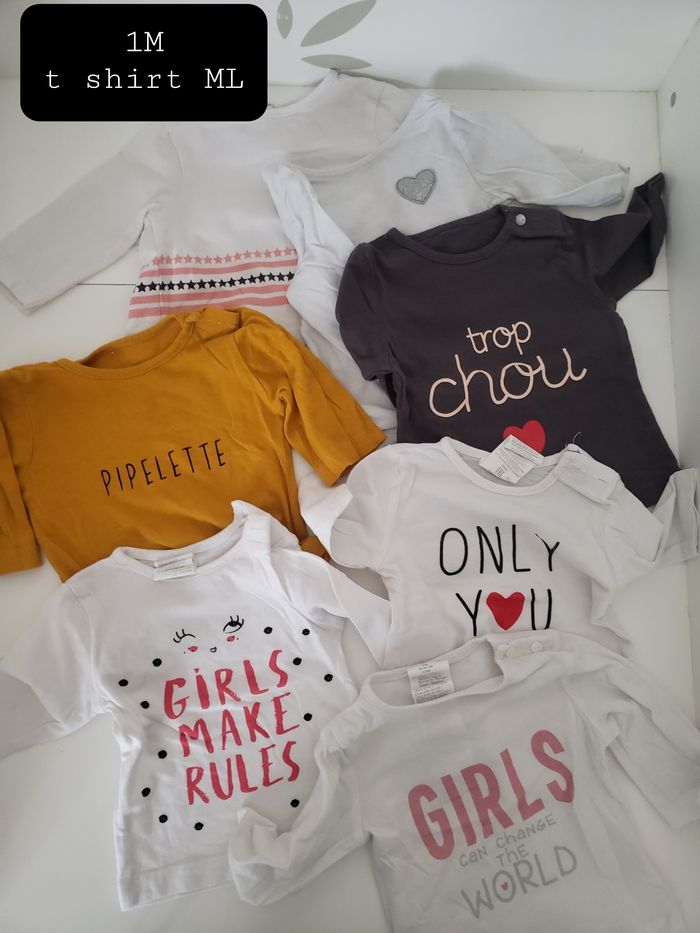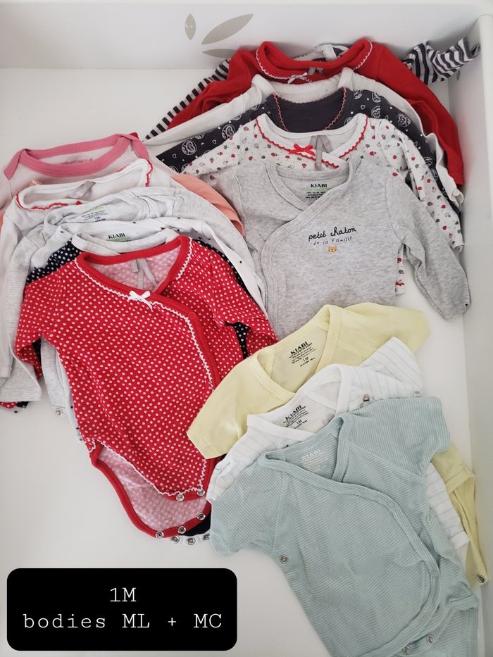 Lot vêtements 1 mois 3 bodies MC 16 bodies ML 7 t shirts ML 2 manteau / polaire 4 gilet / pull 1 robe 1 combishort