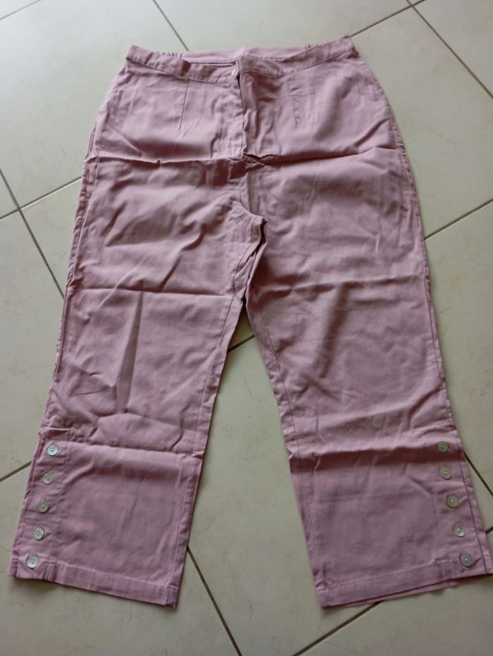 Pantacourt femme neuf resté dans l'armoire jamais mis. Vieux rose bouton fermeture éclair sur le côté des élastique taille Tout en bas sur le côté range de 5 boutons effet nacré 55% lin et 45% coton
