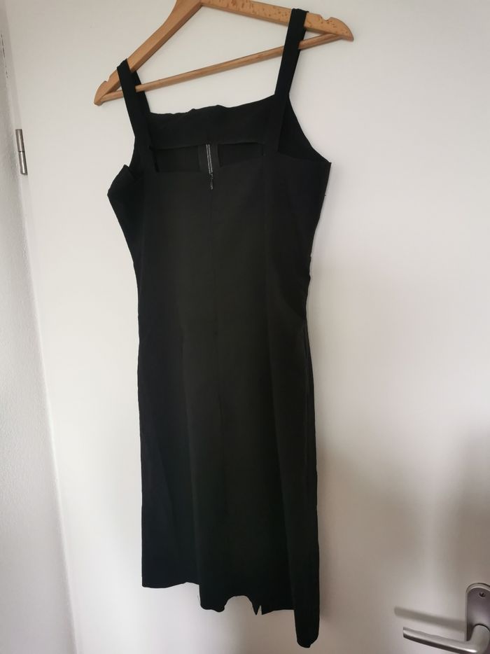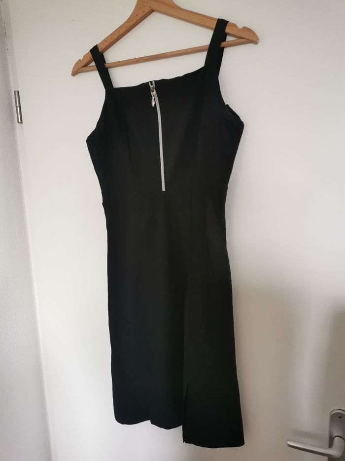 Composition : 74 % viscose, 22 % pa, 4 % lycra Longueur : 90 cm Couleur : noire Taille 2 ou 38 Sans manches Fermeture éclair décorative à l'avant Fermeture éclair au dos 2 fentes à l'avant