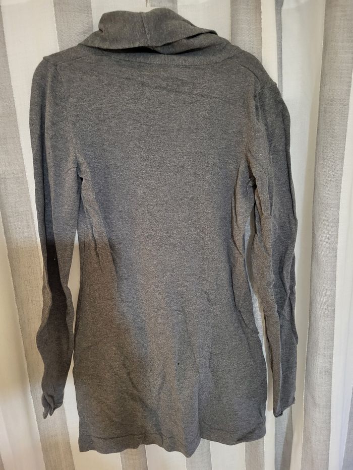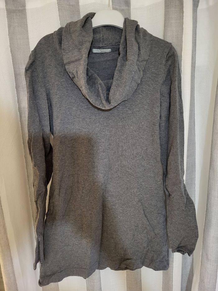 Pull gris long Col roulé large Taille L (petit L) 82% coton 18% polyamide Un peu rêche dûe au lavage