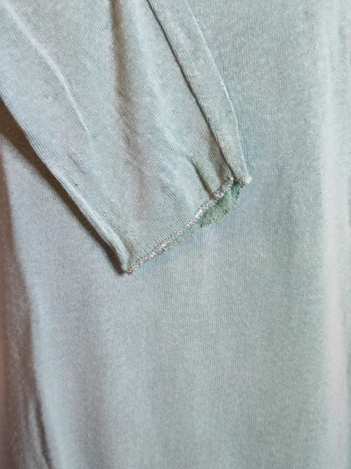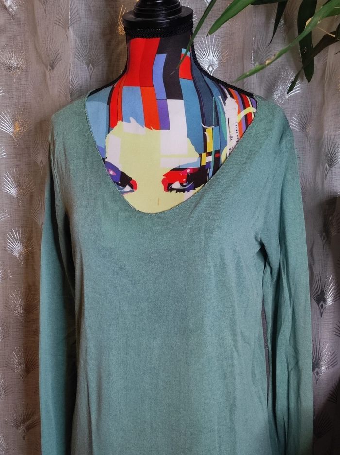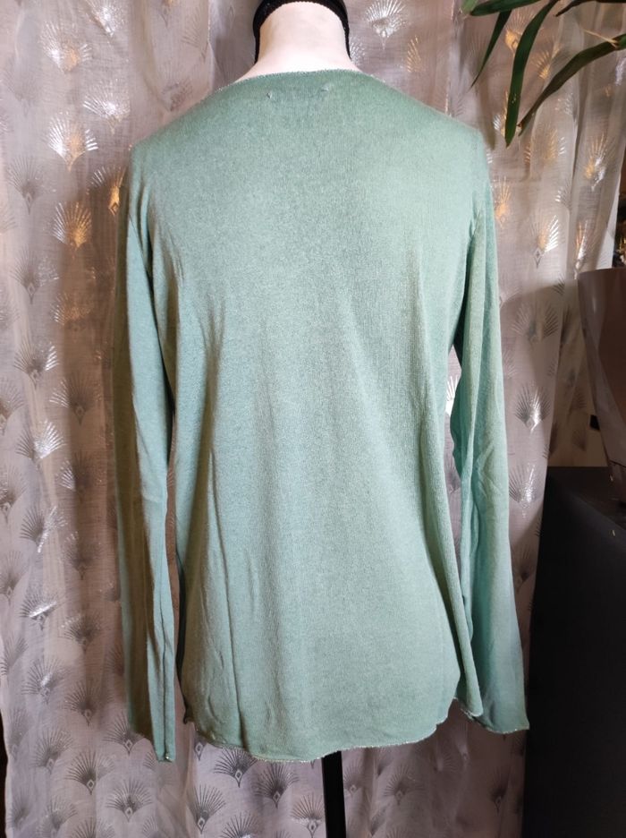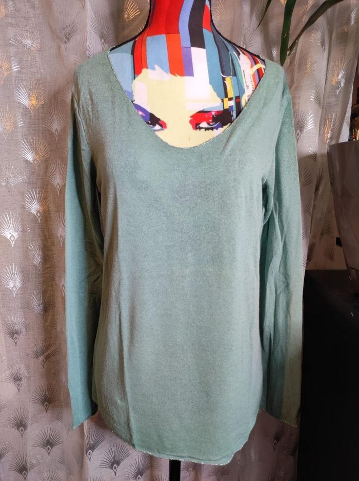Superbe t-shirt uni avec lurex sur le col et bordures des manches longues 100% Coton de couleur vert , leger et fluide agréable a porter. Taille unique