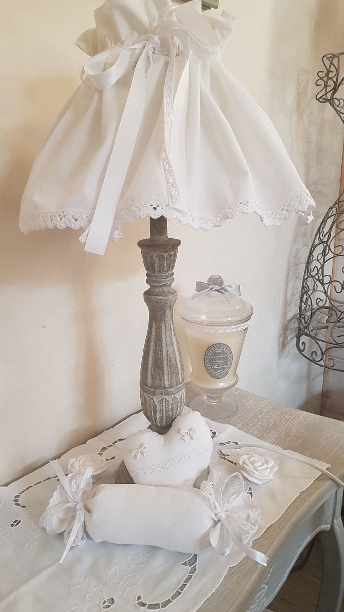 Jupon d abat jour pour chambre d enfant ,salon ou autre..... Tissu coton et dentelle Largeur ajustable Pour un abat jour de 18cm de hauteur ou moins. Pour un esprit shabby, romantique, bohème..... N hesitez pas à me demander des renseignements j ai d autres dimensions .