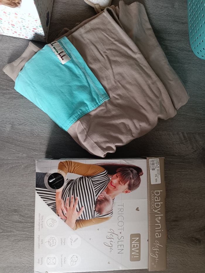 2 écharpes de portage, 30€ l'unité, 1 peu servi (Je porte mon bébé) L'autre, servi 1 fois (tricot slen) elle est noir avec des formes géométriques.