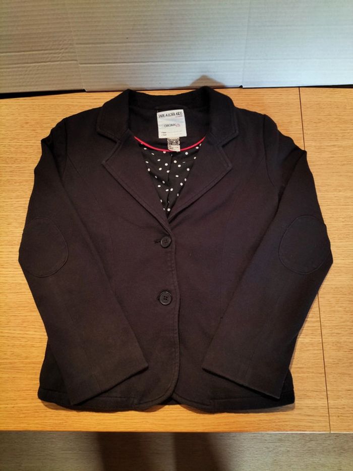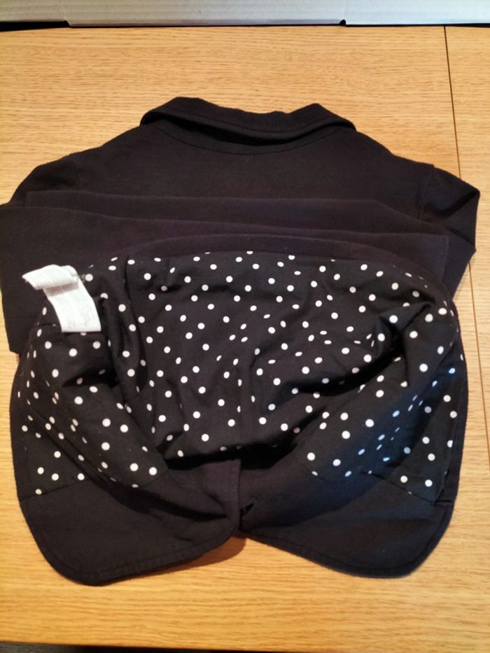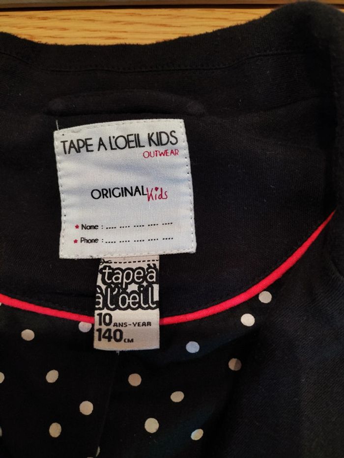 Veste marque tape à l'oeil, taille 10 ans, coupe classique, mais souple car en coton Jersey, doublée tissu noir à pois blanc, deux boutons, Très bon état.