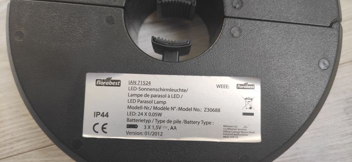 en parfait état fonctionne avec des piles se clipse sur le pied du parasol ( s'adapte pour tous les diamètres de pieds de parasol)