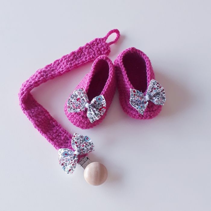 Coffret naissance/set d'accessoires bébé attache tétine et chaussons ballerines bébé tricot noeud liberty fille naissance Ce coffret contient : - une jolie paire de chaussures/ballerines, -une attache tétine avec une pince en bois non traité. L'ensemble bébé naissance est entièrement fait à la main au crochet avec du fil de coton bio doux et agréable au toucher, idéal pour la saison estivale printemps été. Les ballerines et l'attache tétine sont décorés d'un petit noeud en tissu fleuri liberty vintage. Modèle unique ! Envoi rapide et soigné dans du papier de soie délicat. Entretien facile : - lavage en machine programme coton (30°c) - essorage doux (400 tr/min) - pas de sèche linge ni repassage #tricotin #laine #noël #naissance #bébé #fille #garçon #babyshower #cadeau #occasion #bapteme #mariage #evenement #premature #maternité #brassière #kimono #tricot #crochet #bonnet #turban #béguin #robe #princesse #tutu #tulle #liberty #fleuri #doudou #couverture #plaid #guirlande #ballerine #chausson #tétine