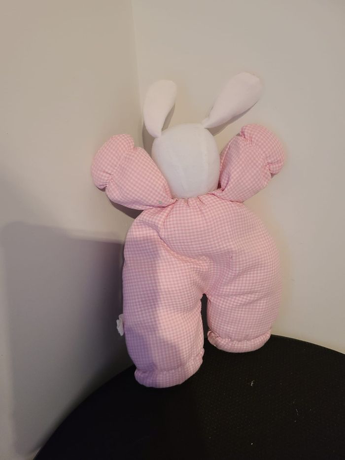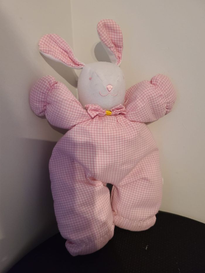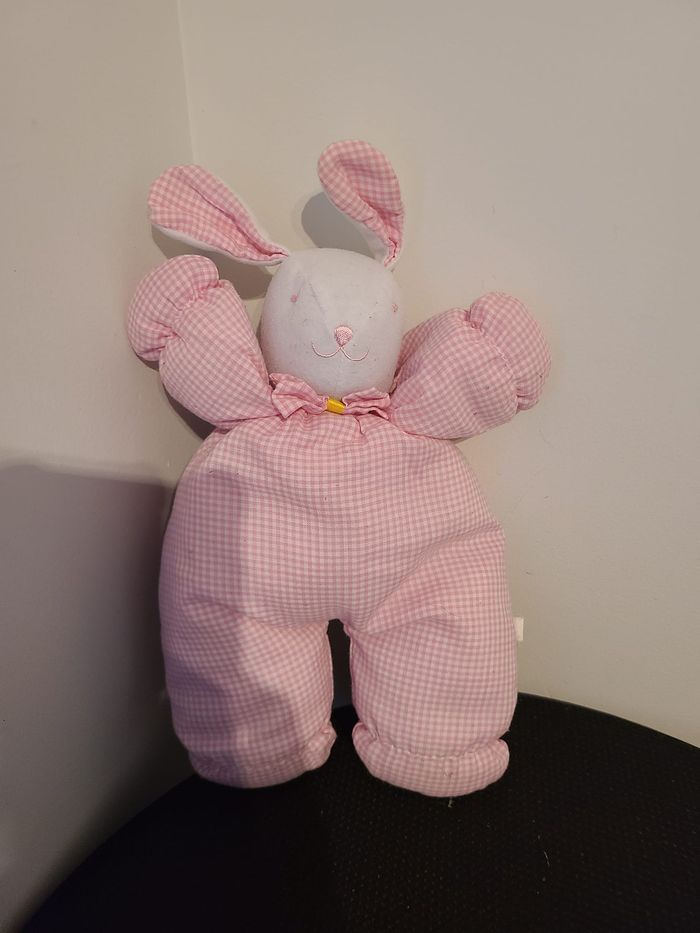 Doudou hochet lapin blanc vichy rose simpson trading en tissu avec grelot petits carreaux blancs et roses 26 cm sans compter les oreilles 116