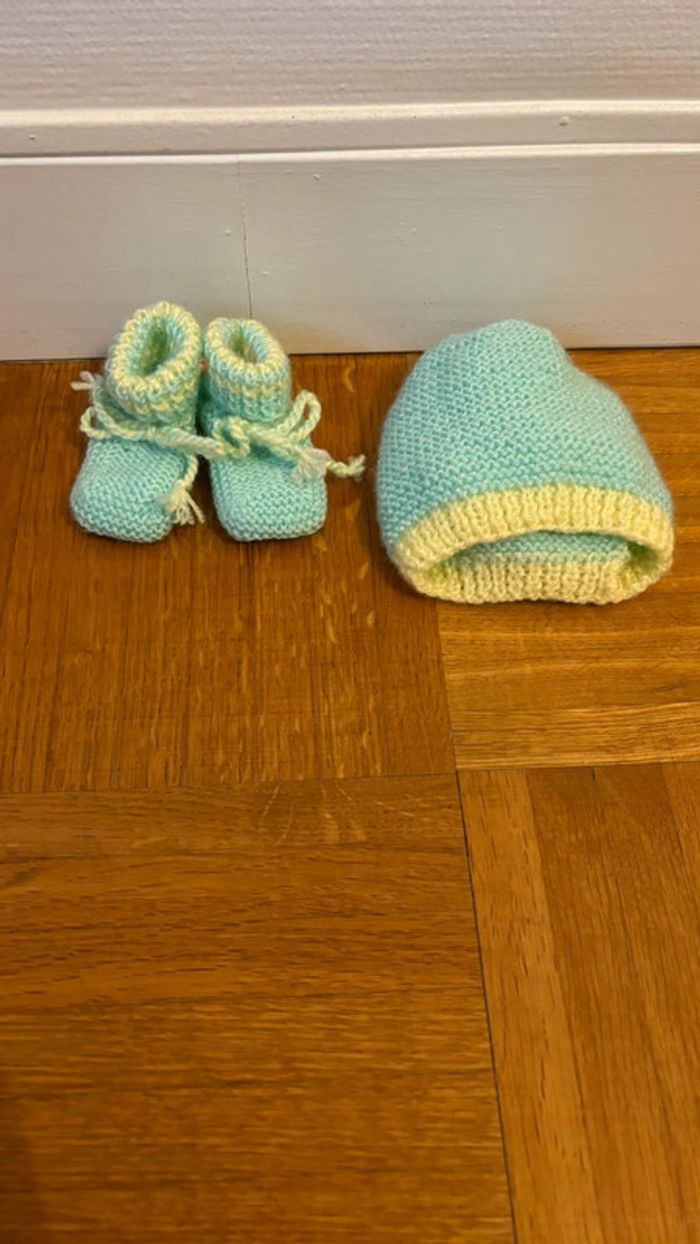 Ensemble bonnet et chaussons tricotés Couleurs : vert et jaune Taille : naissance