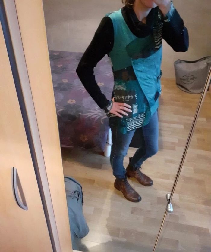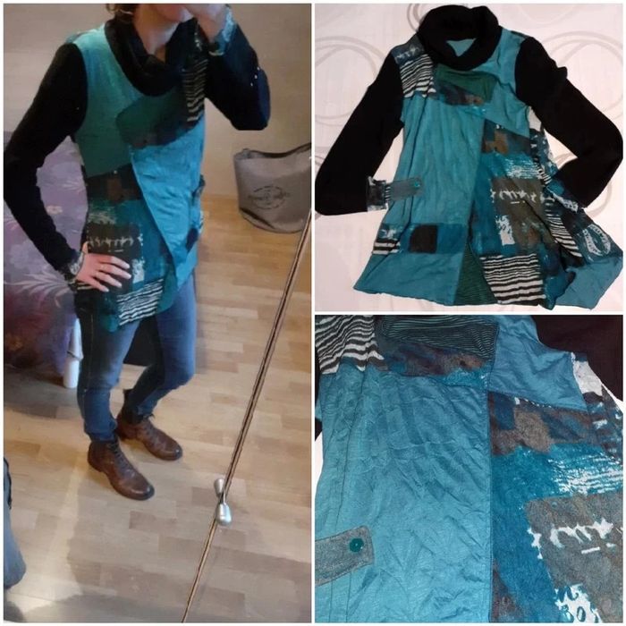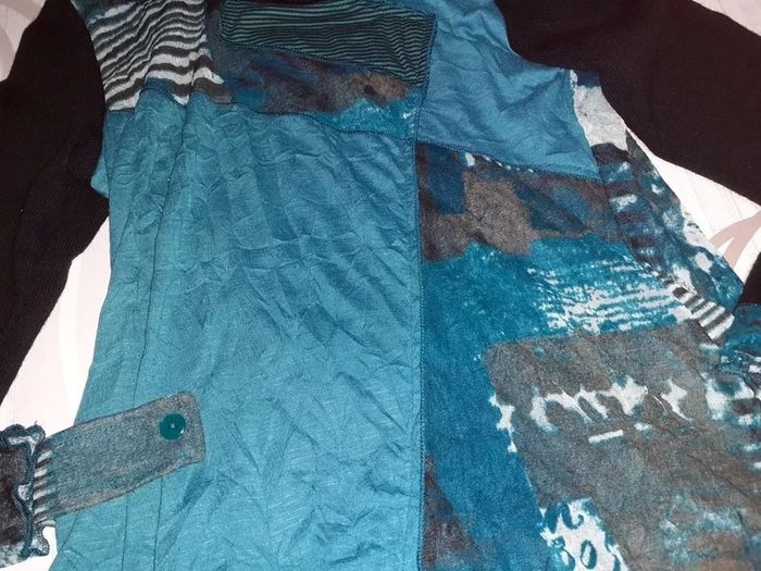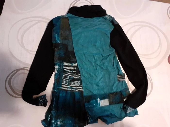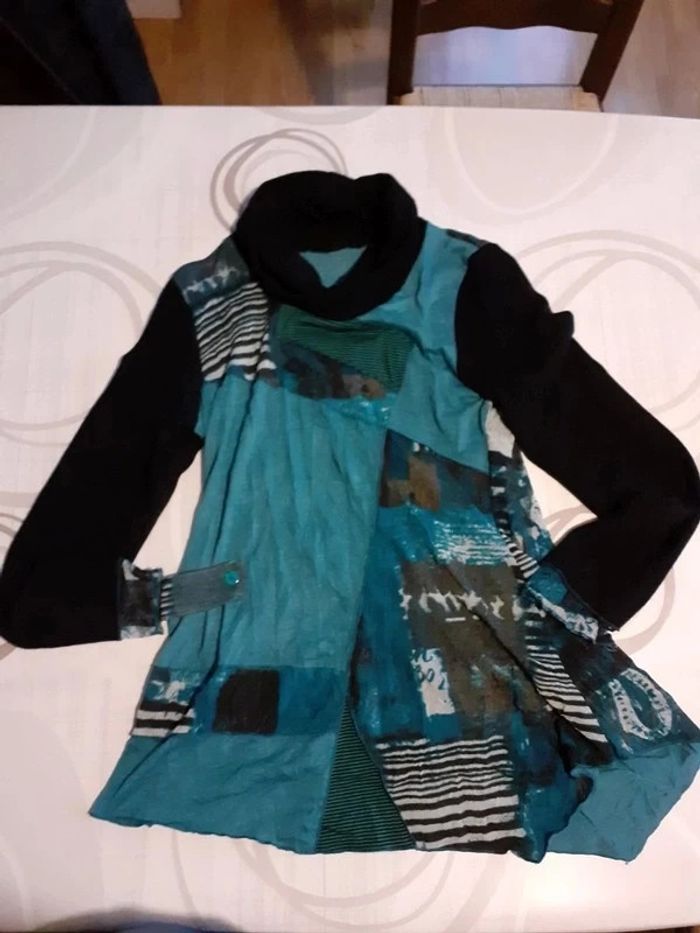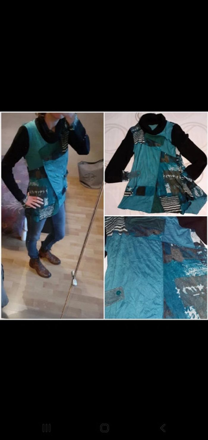 Haut Pull noir et turquoise Marqué taille 2, correspond à un 36 98% acrylique 2% elasthanne Marque: Julie Guerlande #montrentesixfemme Les remises sont activées si plusieurs achats sont faits La liste des filtres # est sur mon profil