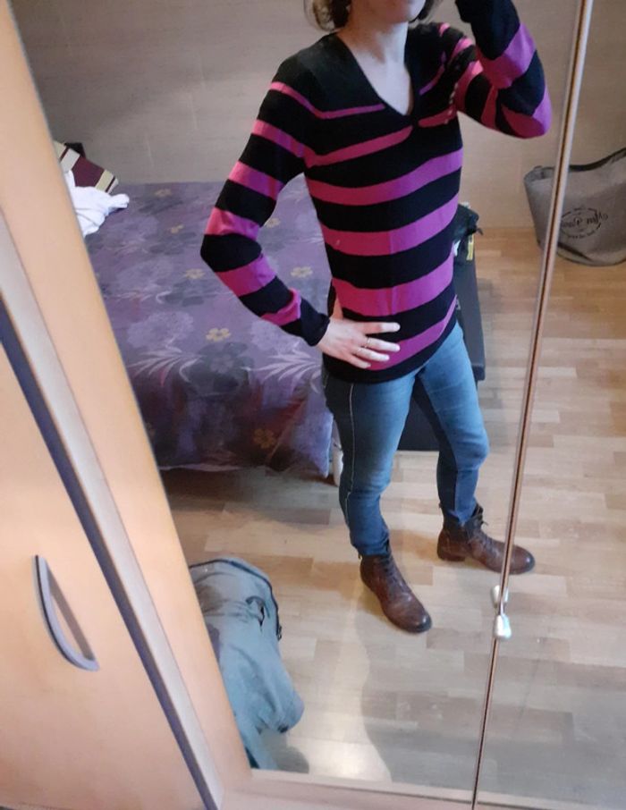 Pull noir et rose rayé Col V Taille S Marque Kiabi (Plus d'étiquette de compo) État neuf #montrentesixfemme Les remises sont activées si plusieurs achats sont faits La liste des filtres # est sur mon profil