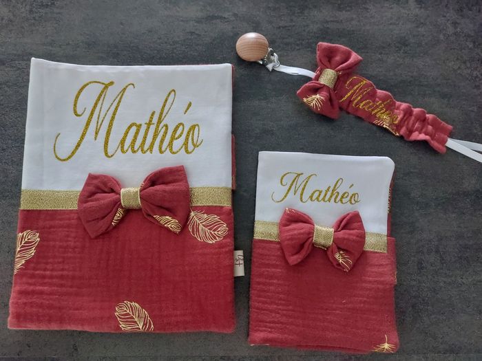 Je vends le lot à 20€ ( couleur corail ) - Accroche tétines Protection : - Carnet de santé - Passeport Personnalisé avec le prénom Mathéo. Vends car achat double.