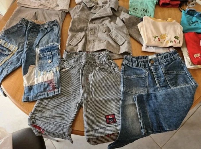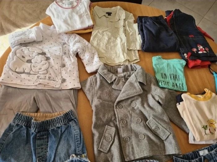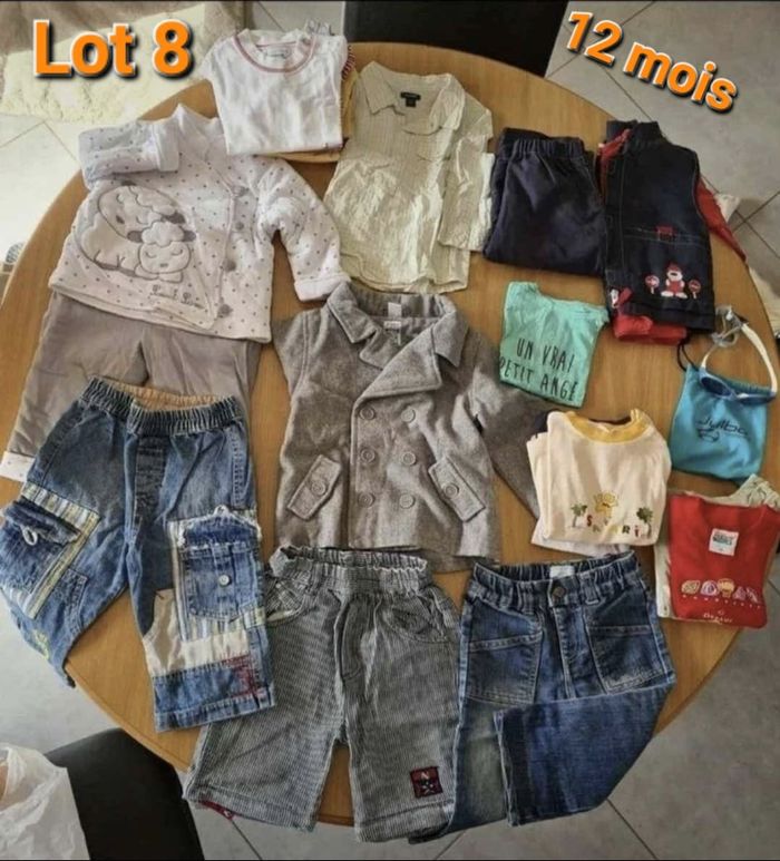 Gros lot de vetements 12 mois + lunettes de soleil Gros lot 25 pièces avec veste manteau, 3 pantalons, 13 hauts manches courtes + longues, 2 ensembles et cadeau 1 paire de lunettes de soleil Julbo offerte Quelques tshirt en bon état, le reste pour la plupart en excellent état Envoi par Mondial Relais Prix FERME pour le lot 15 €