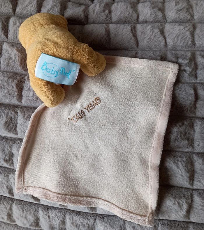 Doudou peluche ours en velours de couleur brun Tien entre ces mains un mouchoir en velours de couleur beige Écriture brodée Baby Nat sur le mouchoir