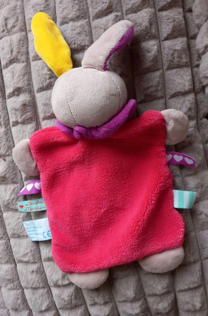 Doudou d amour lapin en velours de couleur rouge rose Col en velours de couleur violet Oreille en velours de couleur jaune et l intérieur en tissu vert à rayures blanches Oreille en velours de couleurs violet et gris Cœur en velours de couleur jaune avec écriture brodé sur le ventre du doudou et 2 étiquettes Étiquettes sur le contour du doudou Baby nat