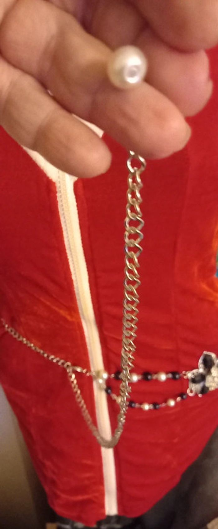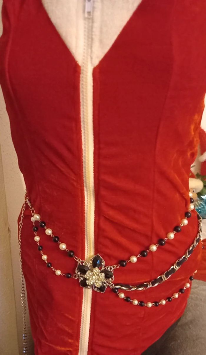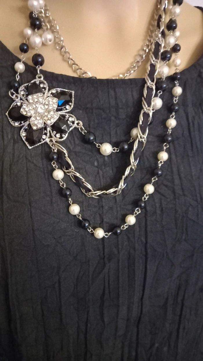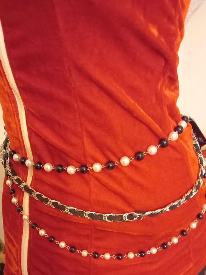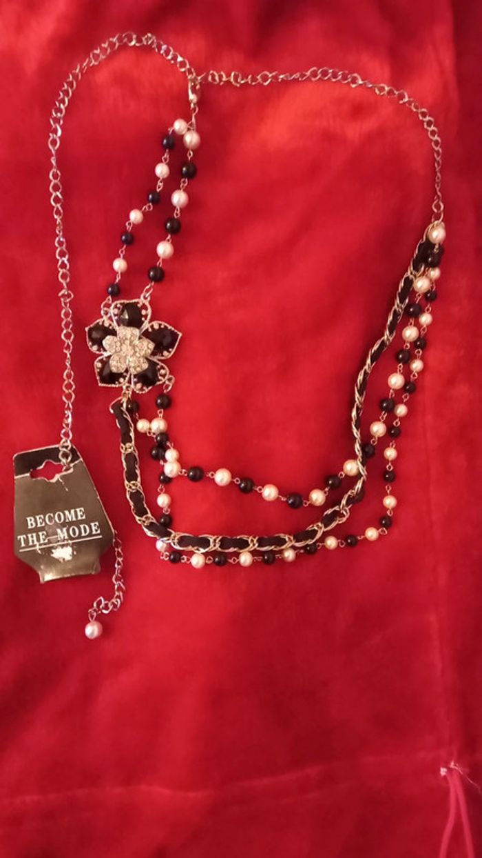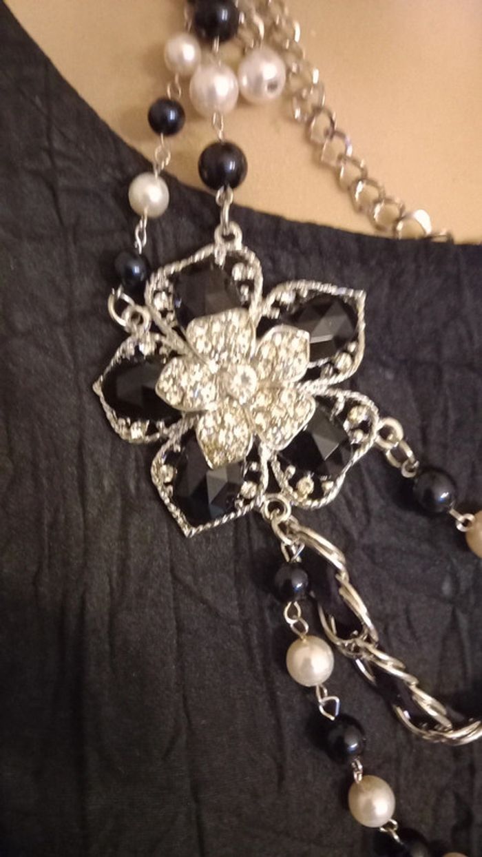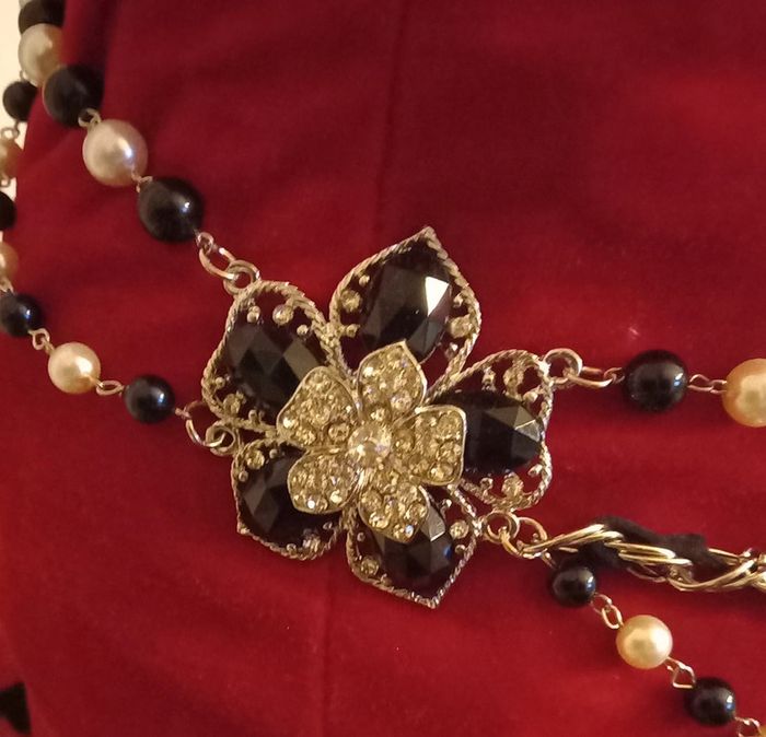 Ceinture réglable peut aussi faire collier Perles noires et nacrés Grande fleur de couleur argenté brillants Pétales de la fleur pierres de couleur noires une fleur au milieu de la grande fleur en petites pierres blanches brillantes style petits diamants La chaîne sert de régler la taille ou le contour du coup Voir photos ci jointe