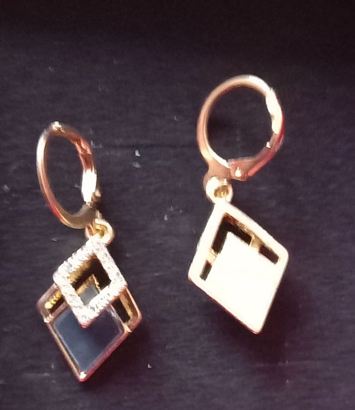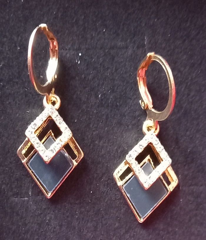 Paire de boucles d'oreilles à trou de couleur dorée Motif: double losange de couleur noir et strass Hauteur : 4 cm 2 cm Diamètre losange