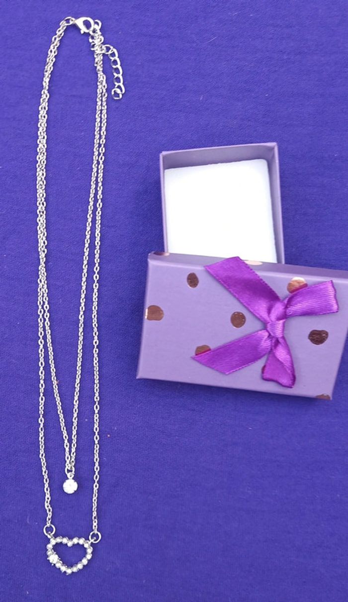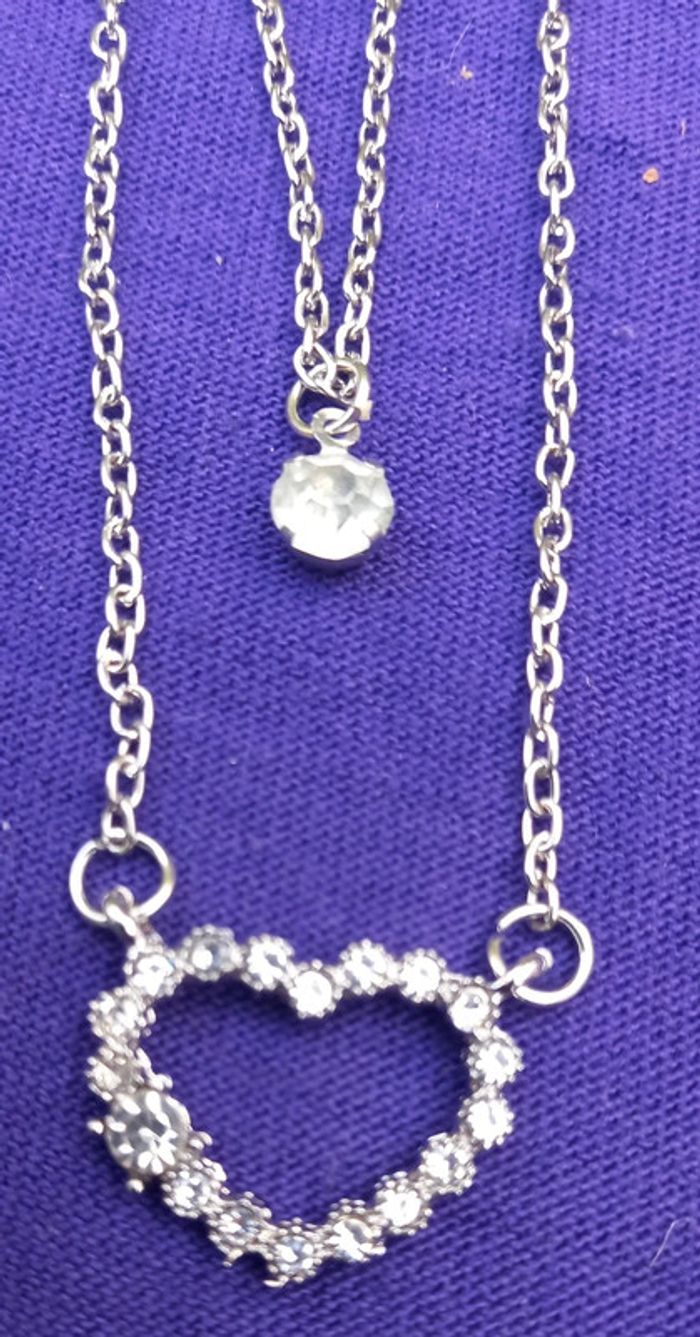 Collier argenté double chaîne avec motifs Sur la chaîne qui est longue 1 cœur en strass pierres blanches brillantes Sur l autre chaîne une petite blanche brillante Longueur du collier : 25 cm Diamètre du cœur : 2 cm Longueur petite chaîne : 17 cm Idée cadeaux