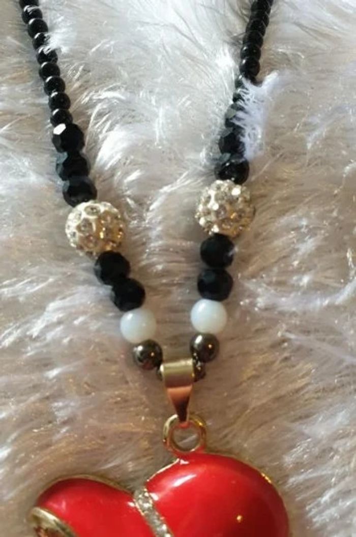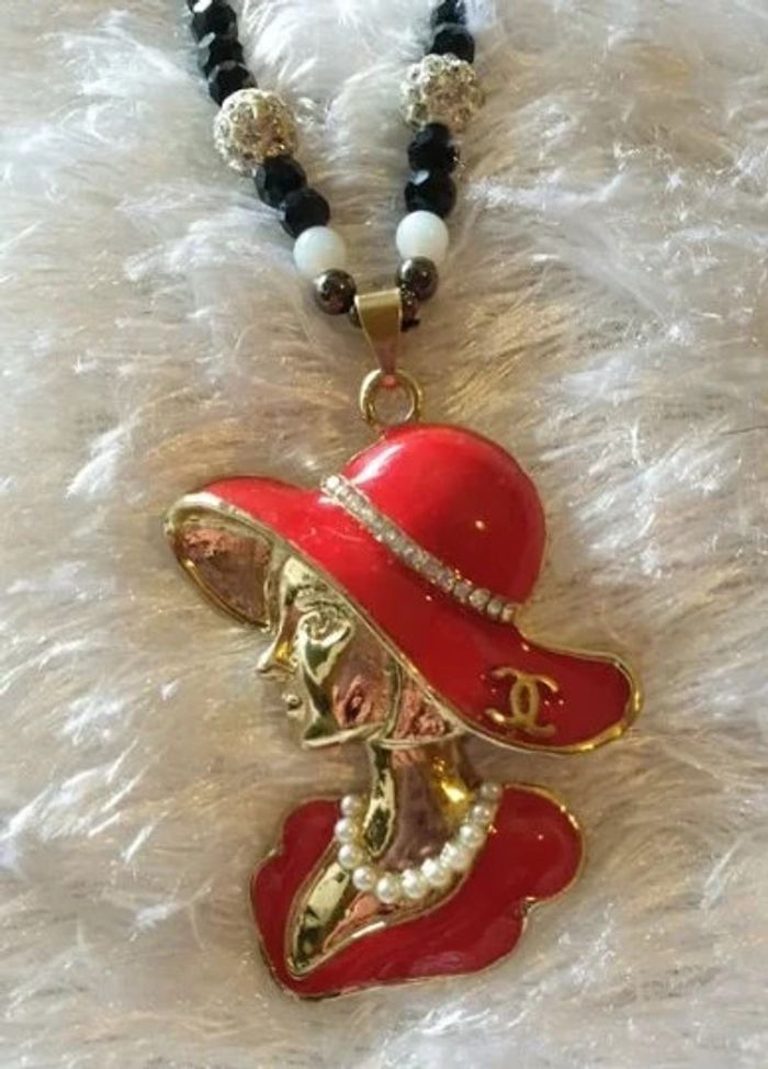 Collier avec pendentif et perles femme au chapeau rouge Les perles sont noires La femme au chapeau rouge en métal dorée avec strass longueur du collier 31,5 cm hauteur du pendentif 5,5 cm X 3 cm de largeur