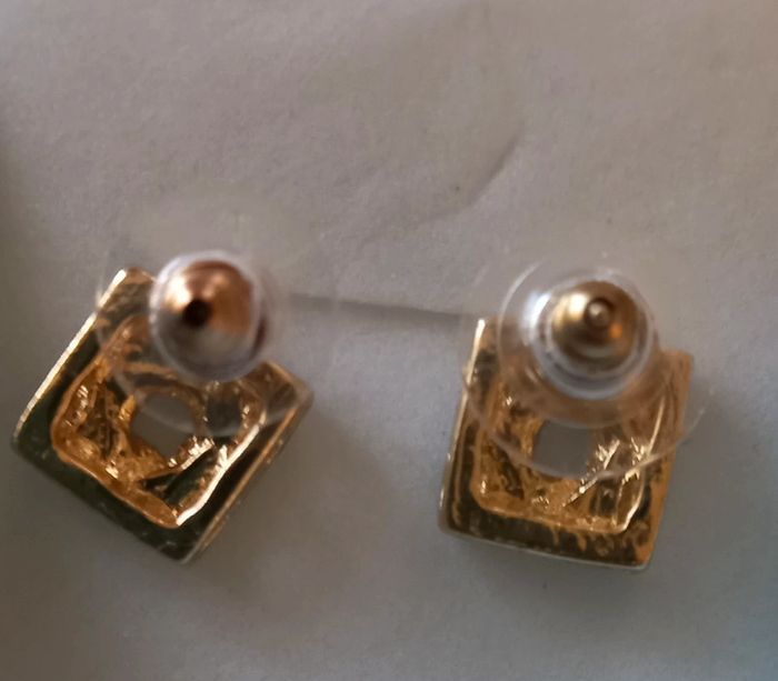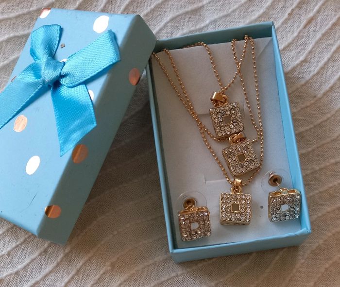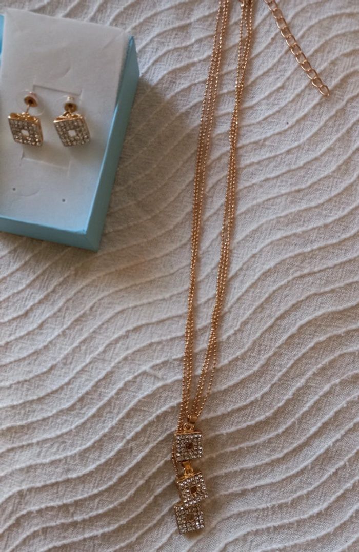 Ensemble collier + Paire de boucles d oreilles de couleur doré avec motif carré avec petites pierres cristal blanches Le collier se comporte de 3 rangées de chaîne plus petits au plus grand avec même forme que les boucles d'oreilles Longueur collier 23 cm + 7 cm Diamètre cube 1cm