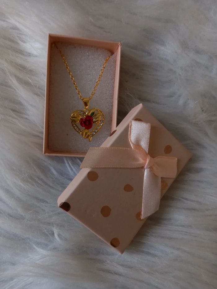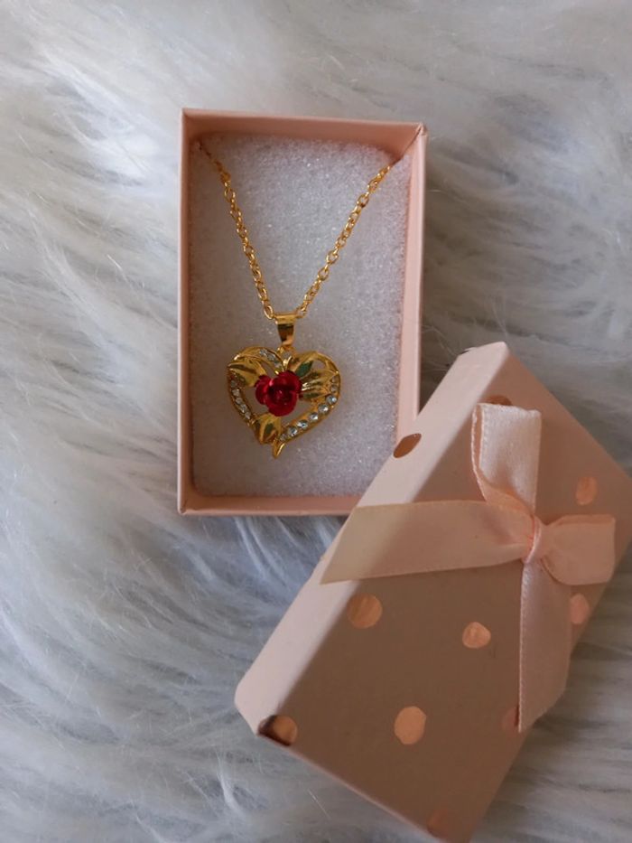 Collier femmes de couleur doré avec pendentif forme cœur doré Rose rouge au milieu du cœur et strass autour Longueur chaîne :44 cm + 5 cm Diamètre cœur : 2,5 cm