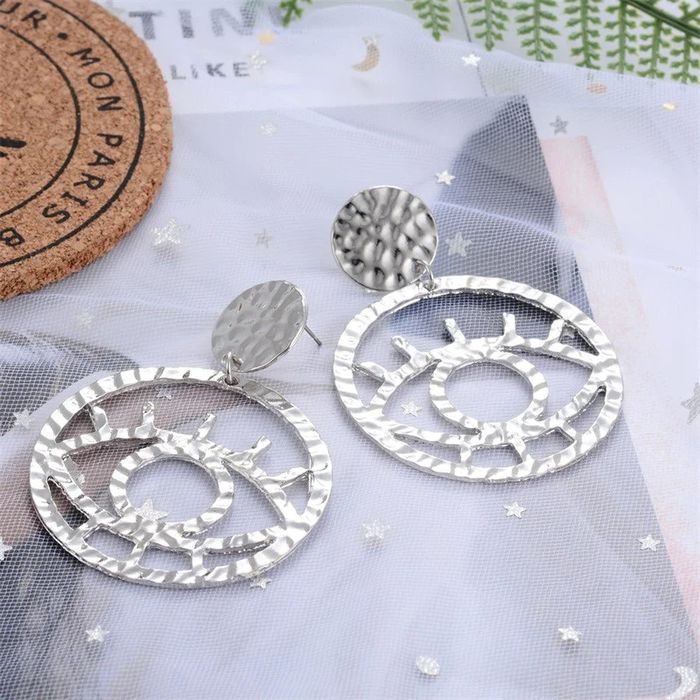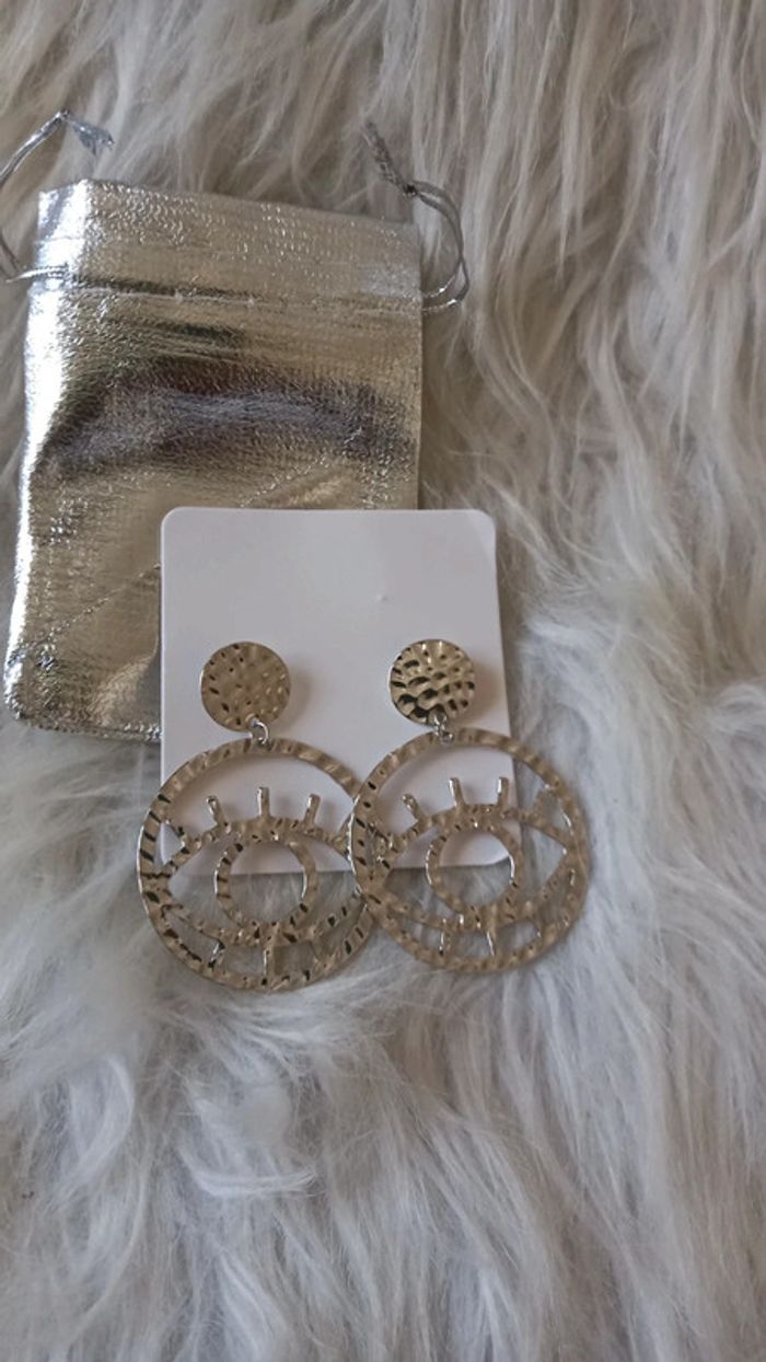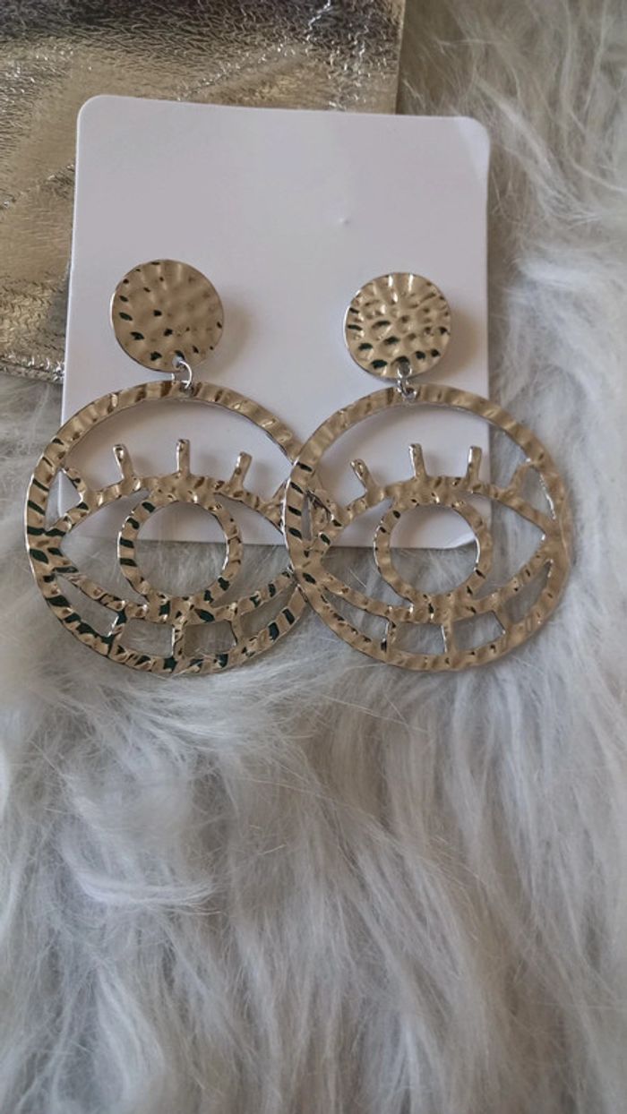 Paire de boucles d'oreilles Fantaisie pendantes de couleur argenté Anneau avec au milieu un œil Voir photos Longueur total : 7 cm Diamètre du grand anneau : 5 cm Diamètre du petit anneau argenté 2 cm