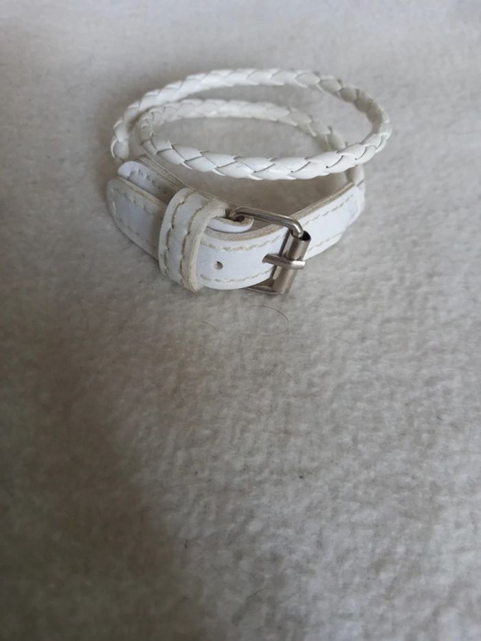 Bracelet en cuir blanc à cordages ,fermoir comme les ceintures Longueur ouvert et poser à plat : 44,5 cm Pour le mettre vous l ouvrez et l enrouler autour de votre poignet puis le fermer avec la sangle ceinture Article neuf sans emballage