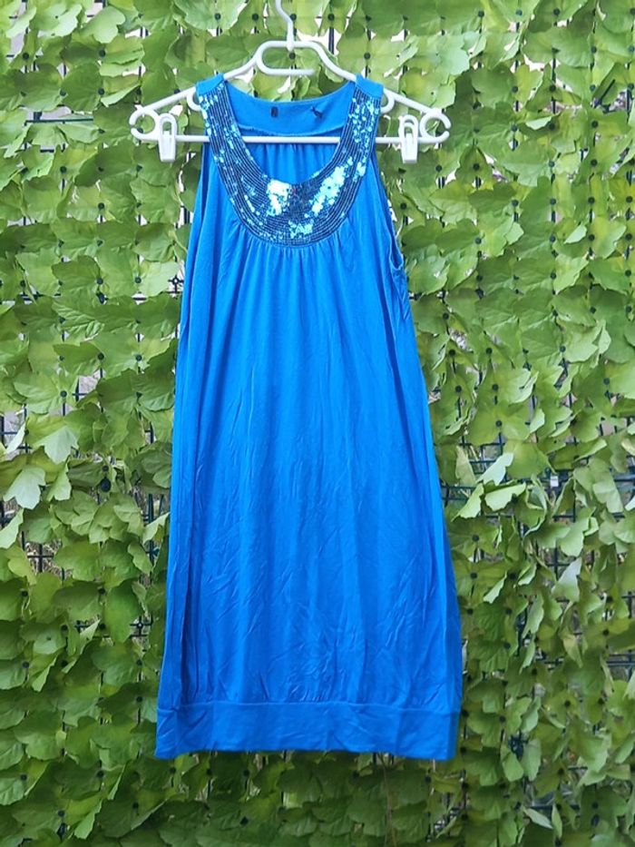 Robe bleue avec brillants bleues sans manches Longueur : 87 cm Longueur à partir des sous bras : 66 ,3 cm Largeur aisselle à aisselle : 46 cm. Matieres : 40 % Viscose 60 % polyester Taille : unique En très bon état