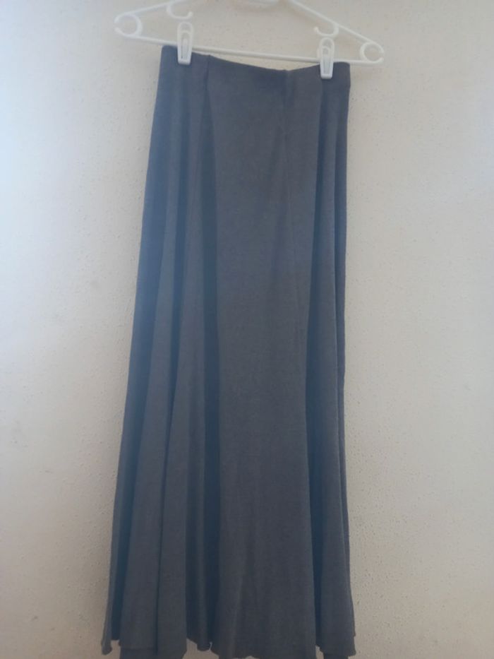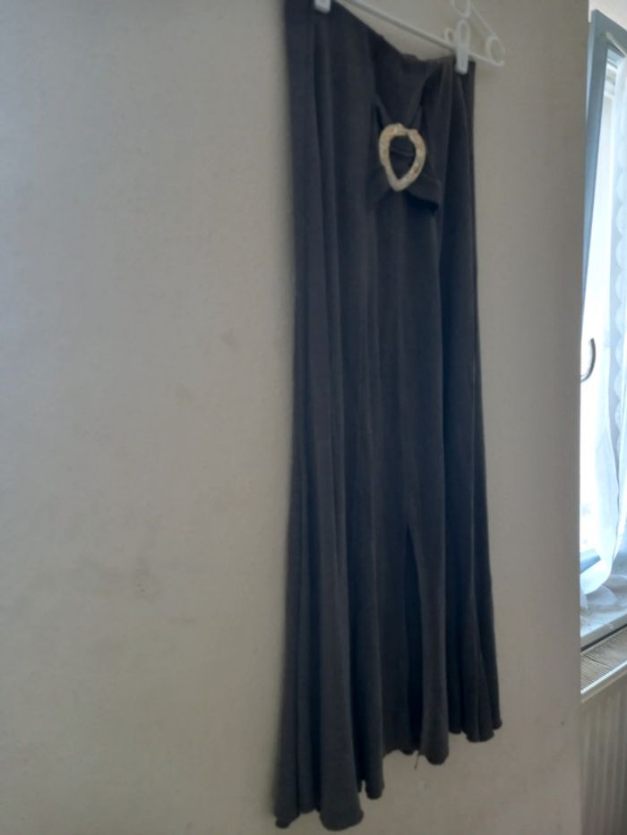 Longue jupe évasée avec 1 cœur au milieu de la taille et une ouverture au bas de la jupe Couleur brun et cœur doré Longueur : 83,5 cm Longueur de la fente au bas : 28,5 cm Matieres : 50 % Acrylique 50 % Viscose Taille : 38 Très bon état