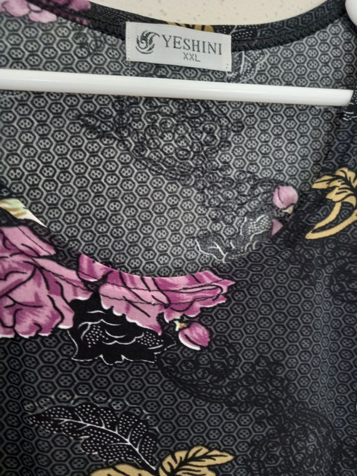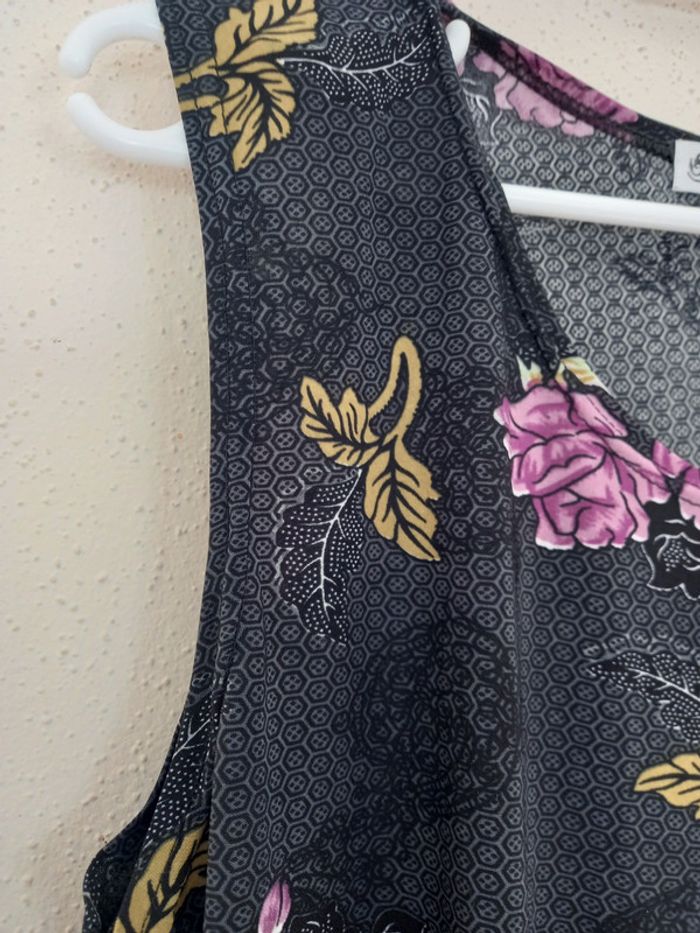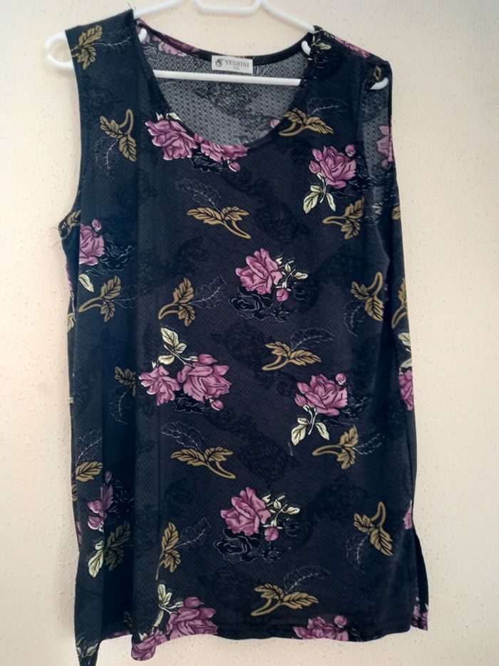 Débardeur noir sans manches avec fleurs roses mauves et feuilles vertes Longueur : 69 cm Longueur à partir des sous bras : 47,5 cm Largeur aisselle à aisselle : 53 cm Marque : Yeshini Taille : XXL En Très bon état