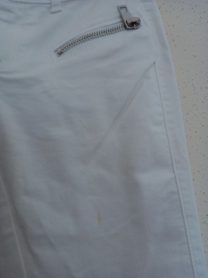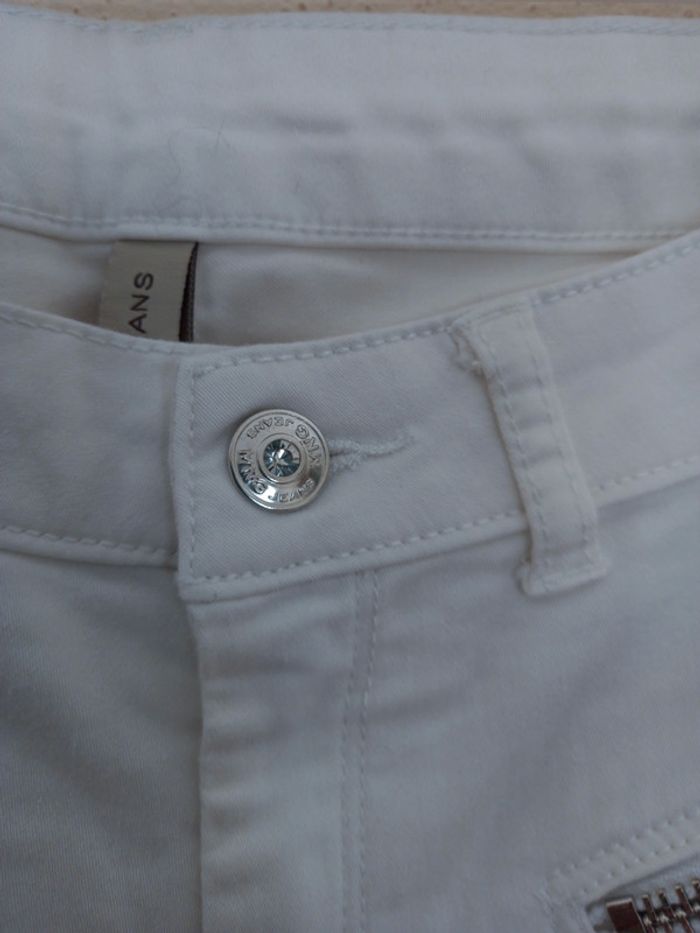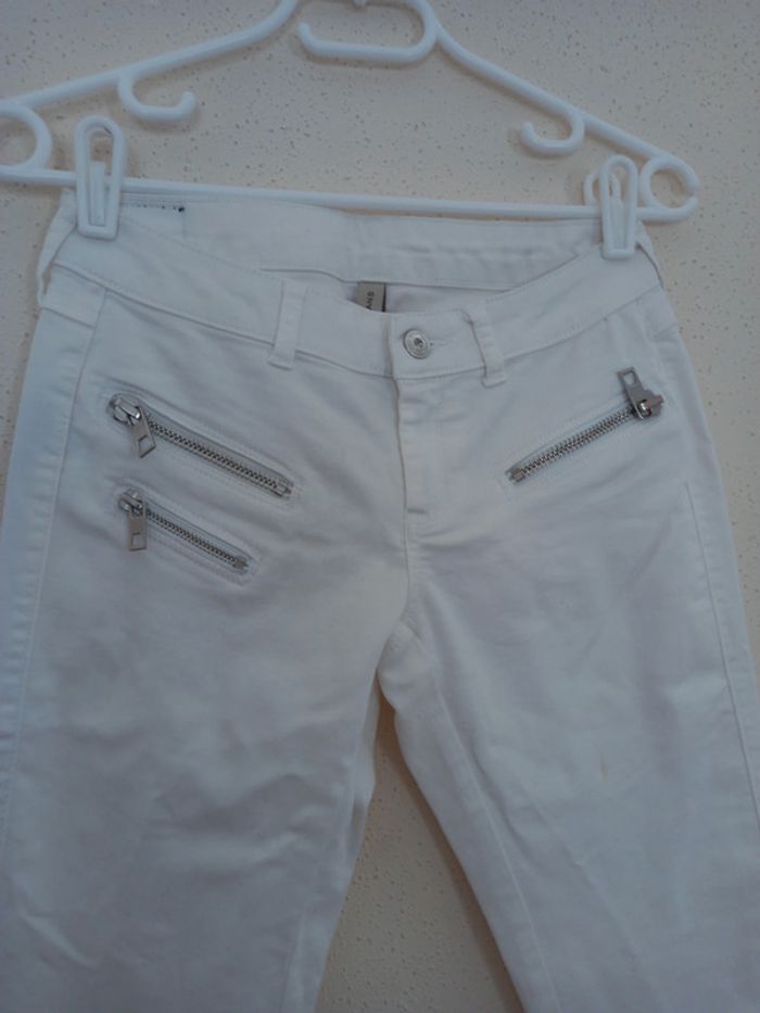 Pantalon blanc jeans avec une légère petite tache sur la cuisse gauche comme le montre les photos Se ferme par un zip et 1 bouton argenté avec pierre blanche brillante Également 3 poches devant avec zip Marque : Mango Jeans Taille : 34