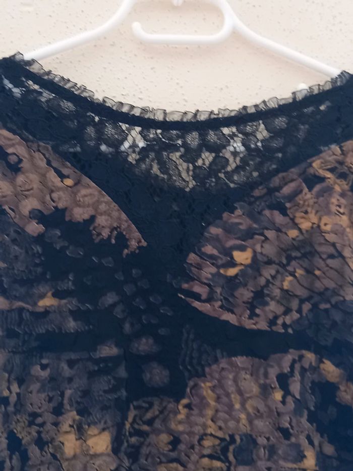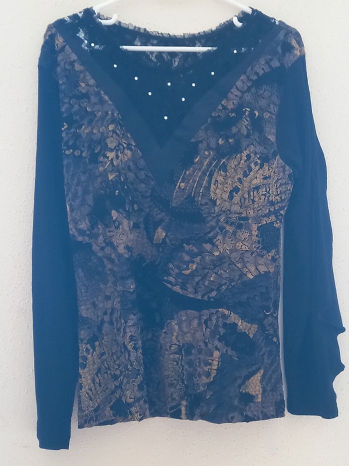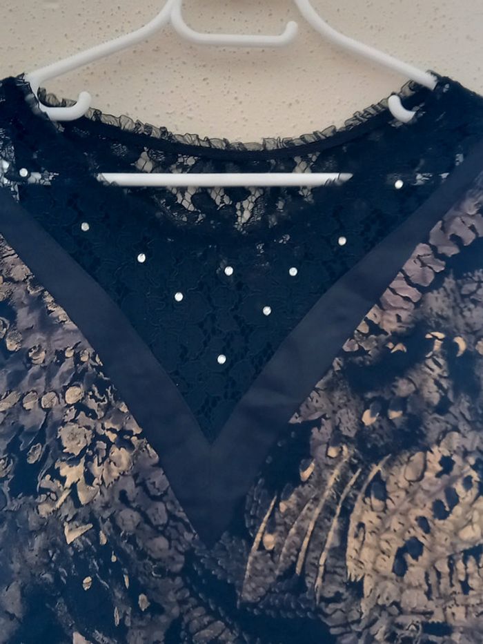 Magnifique Haut à manches longues avec motifs et dentelles noires et 10 pierres blanches sur la dentelle Les manches sont noires Unis Matieres : 92 % polyester 8 % ELASTHANNE TAILLE UNIQUE Article neuf sans étiquette