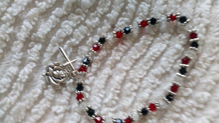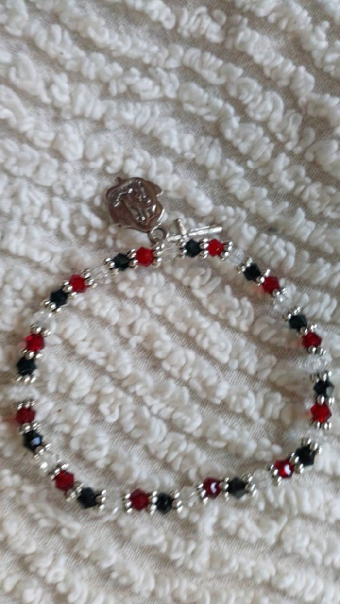 Bracelet femmes à élastique avec perles noires blanches et rouges avec croix argentée et roseraie au recto de la roseraie vous avez la vierge et la Sainte Bernadette ARTICLE NEUF