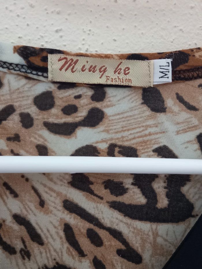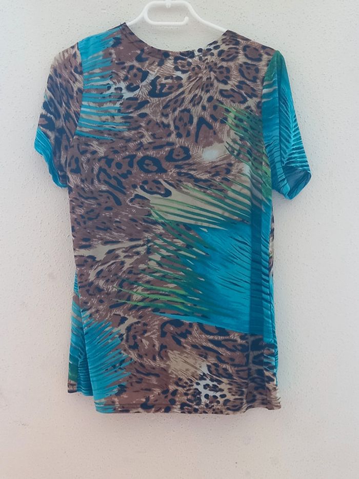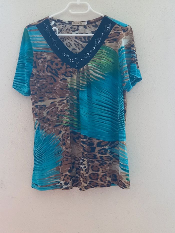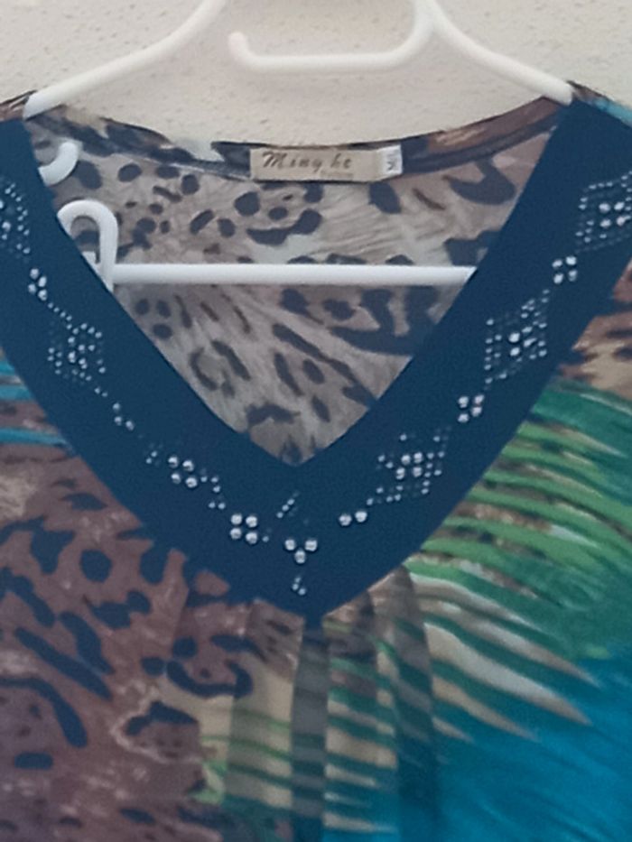 Long T-Shirt avec divers couleurs les couleurs de l été. Col noir avec pierre brillantes Marque : Ming He Fashion Taille : M/L En Très bon état