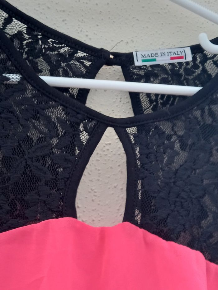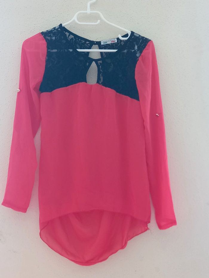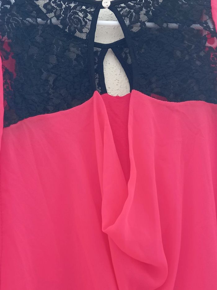 Très jolie tunique rose fushia avec dentelles noirs et dos decouvert ; manches longues voilage et doublure Taille : 40 En parfait état