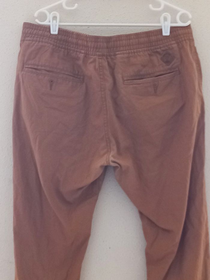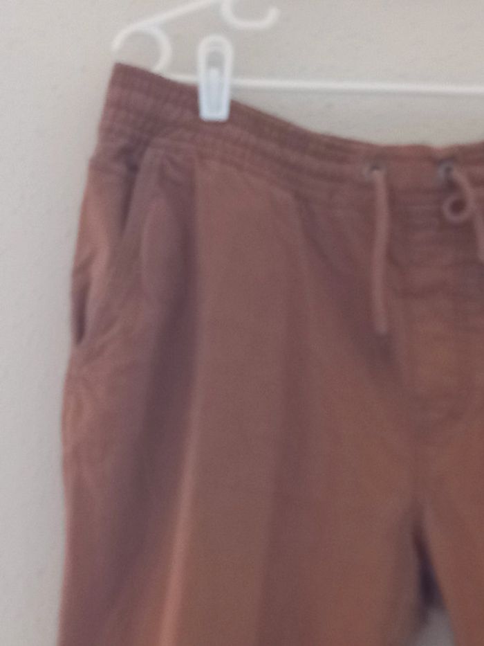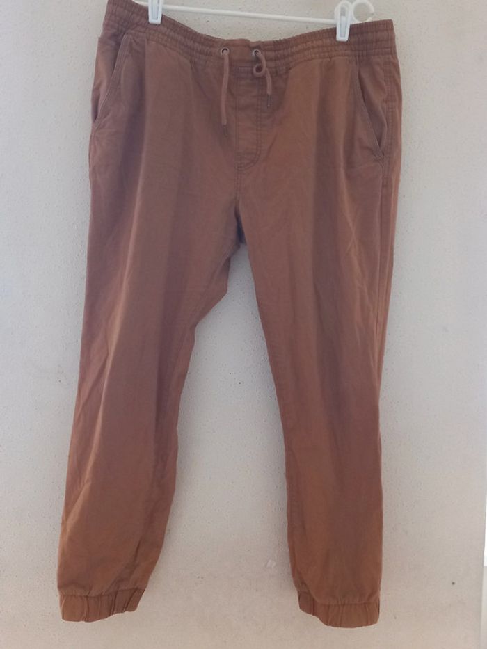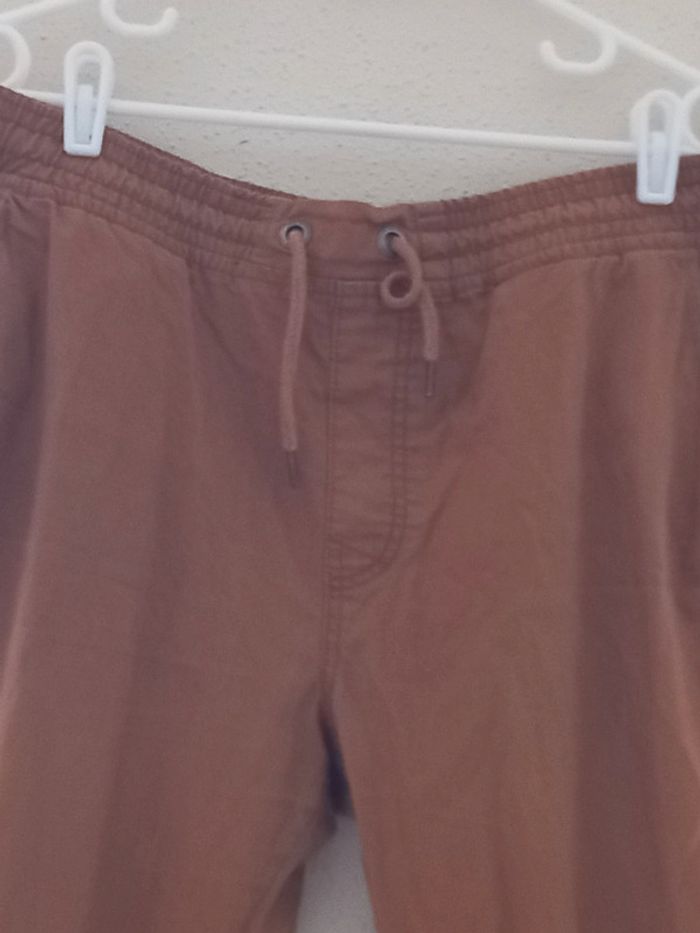 Pantalon de couleur brun avec poches avant et arrière se sert à la taille avec ficelles et serrer au bas du pantalon Acheter chez Kiabi Article d occasion en très bon état voir photos ci contre