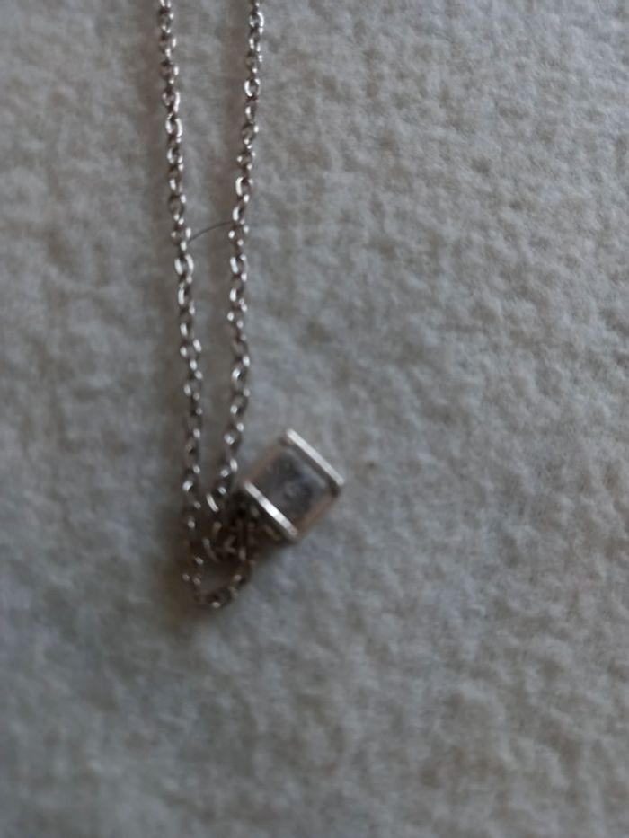 Collier de couleur argenté avec pendentif cube avec pierre blanche à l intérieur Article neuf sans emballage