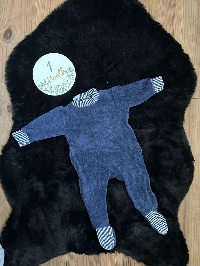 Pyjamas en velours à manches longues bleu 👍 En bon état, matière un peu passé Étiquette en 3 mois, mais taille petit (idéal 1M)