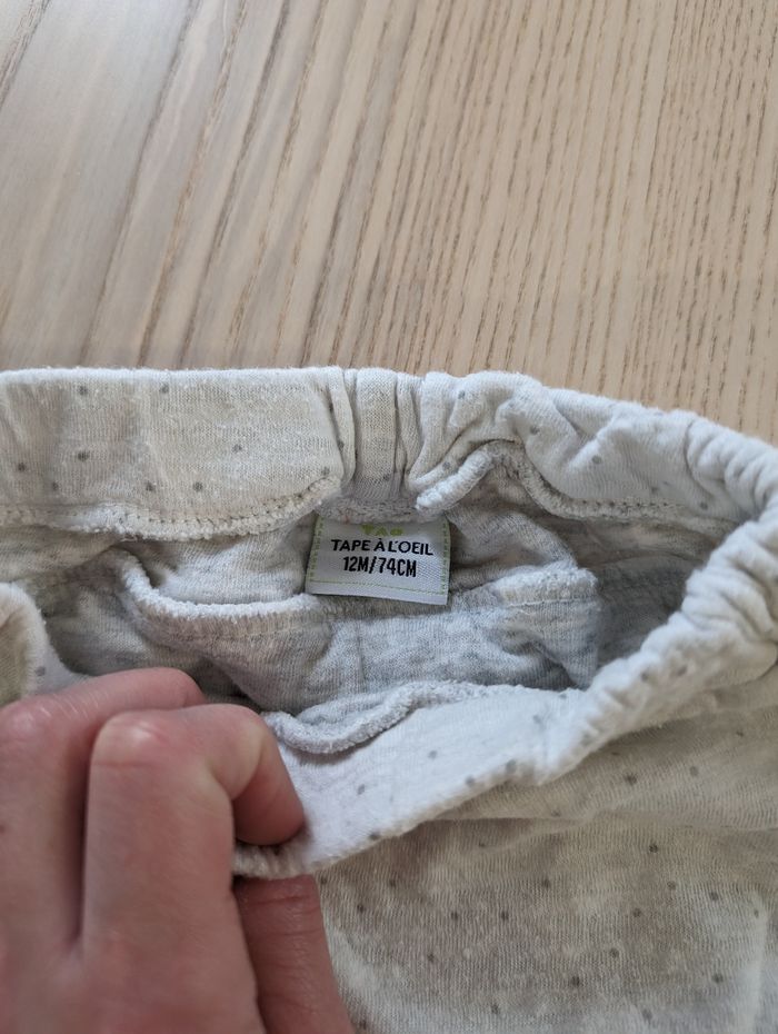Pantalon confortable. Marque Tape à l'oeil TAO. Taille 12mois/74cm. Etat satisfaisant pas de tâches mais traces d'usure (bouloches) visibles sur la dernière photo mais encore largement portable. #tennyteb12mois
