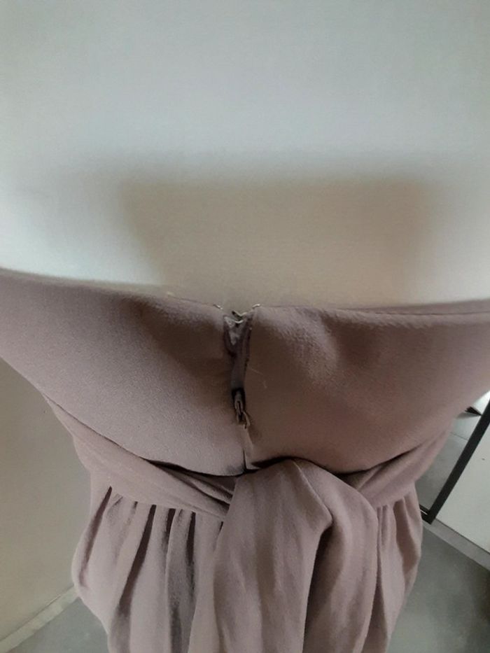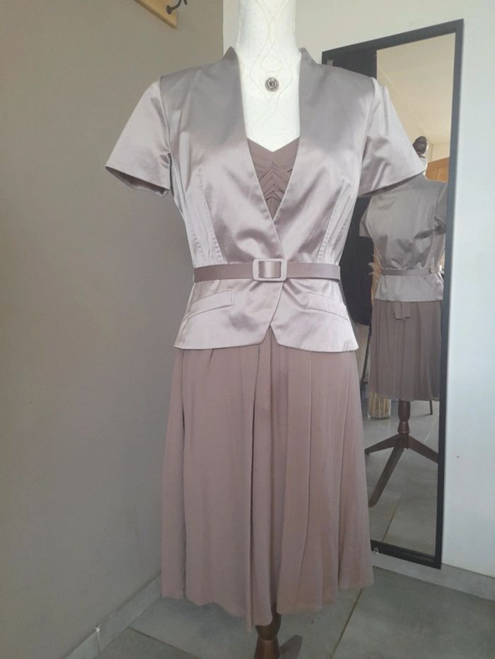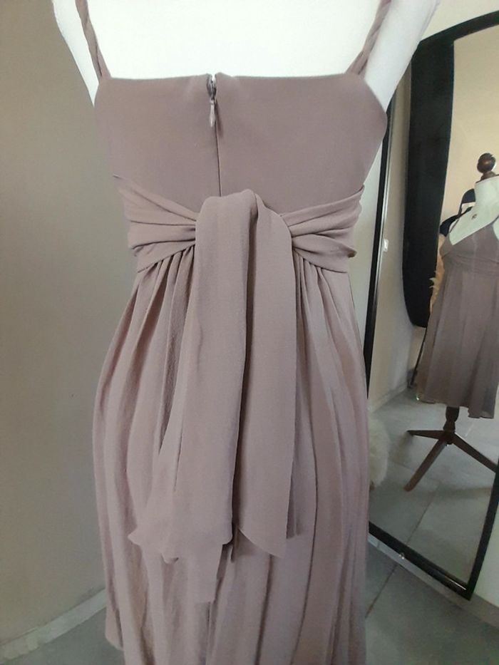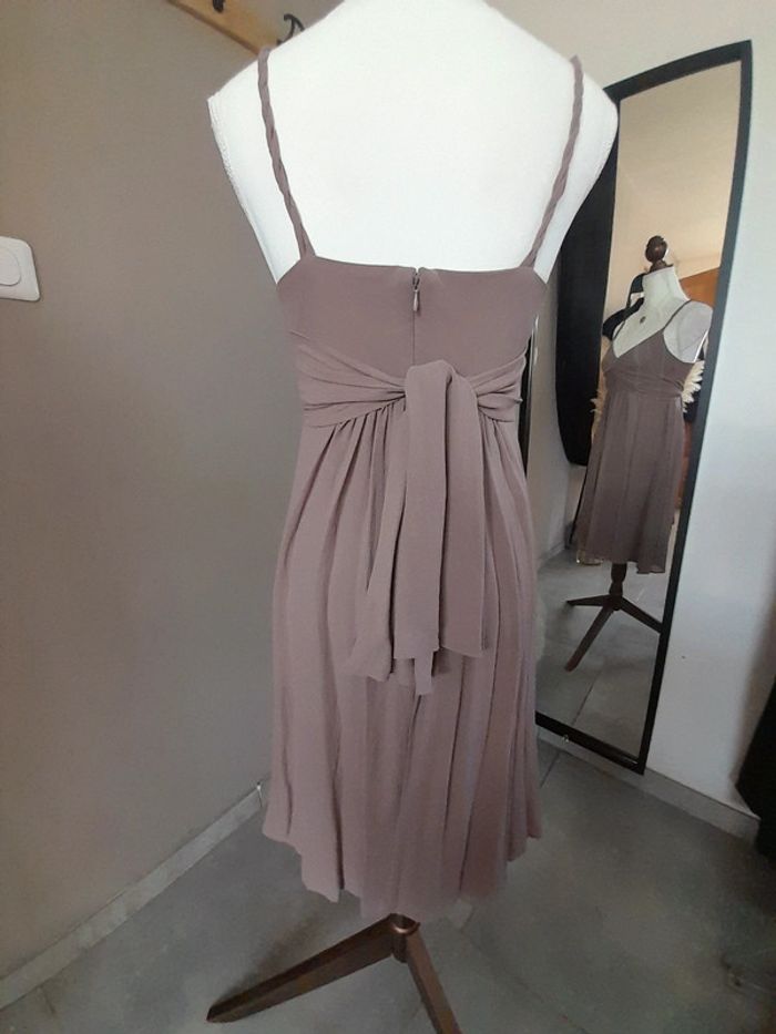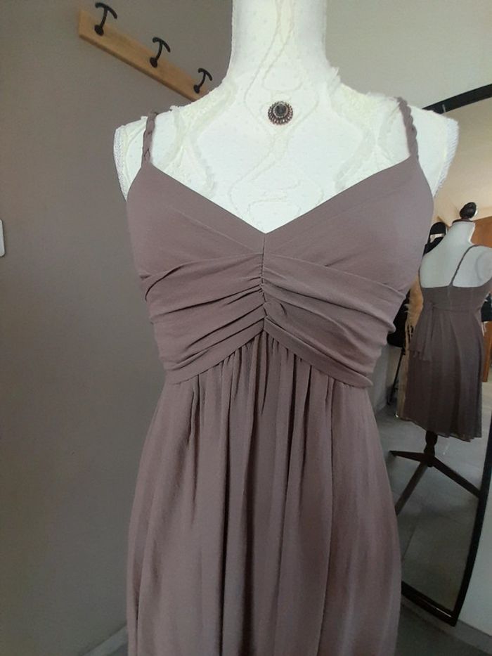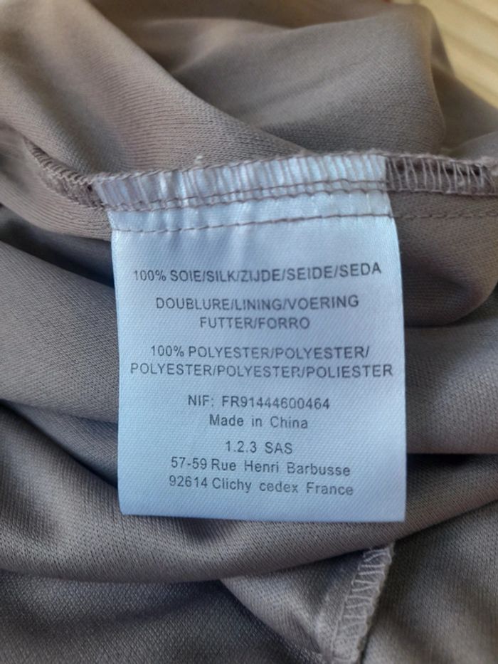 Robe à bretelles en soie de la marque Maison 1 2 3 Liens à nouer au dos Couleur taupe Taille : 38 En très bon état, porté 2 fois Je vends aussi la veste assortie (voir dernière photo)