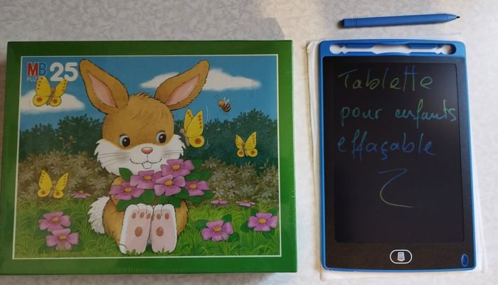 Le tableau LCD couleur enfant est effaçable d'un seul bouton et peut être réécris plusieurs fois avec le stylet fourni. Le puzzle de 25 pièces est neuf jamais ouvert à partir de 3 ans.