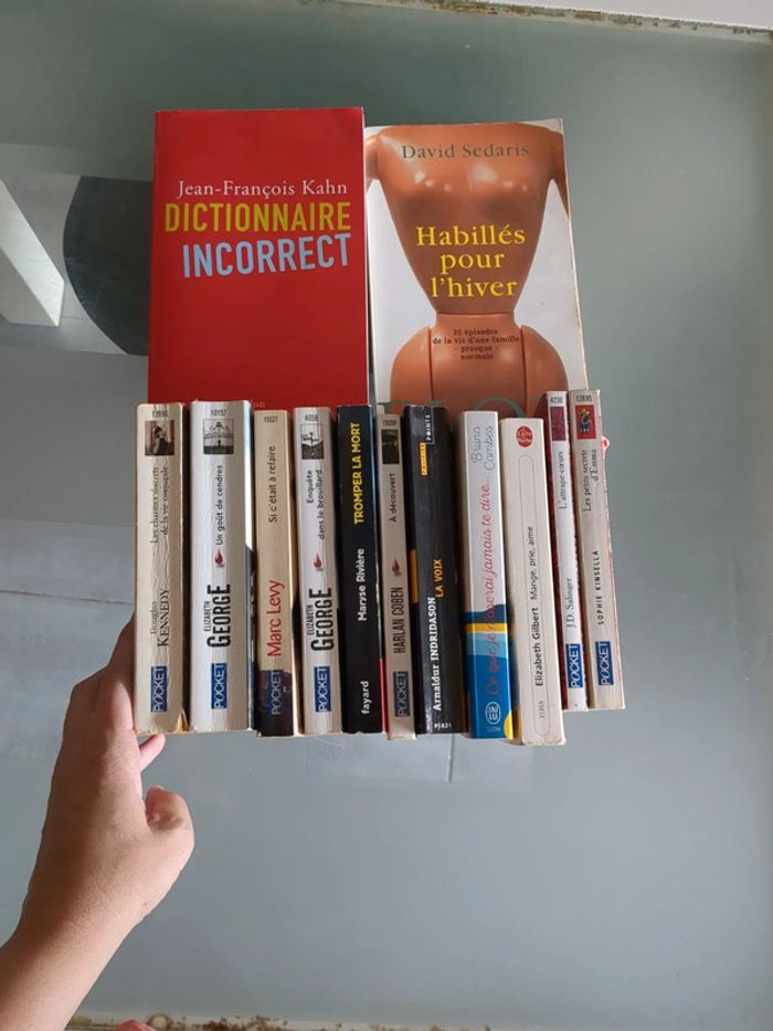 Marc Lévy si c'était à refaire L'attrape coeurs de Salinger Un goût de cendres et enquête dans le brouillard d'Elizabeth Gorge La voix d'Arnaldur indridason Mange prie aime d'Elizabeth Gilbert A découvert d' harlan coben Tromper la mort de Maryse rivière Les charmes discrets de la vie conjugale de Douglas Kennedy Dictionnaire incorrect de jean François Kahn Etc Romans, thriller, policier, nouvelles, dictionnaire de quoi lire pour la fin de l'année 2023