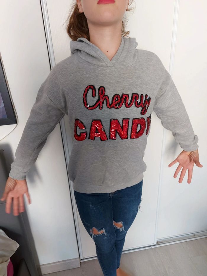 Sweat à capuche gris, inscription cherry candy. Légère tâche au dessus du R, peut partir au lavage